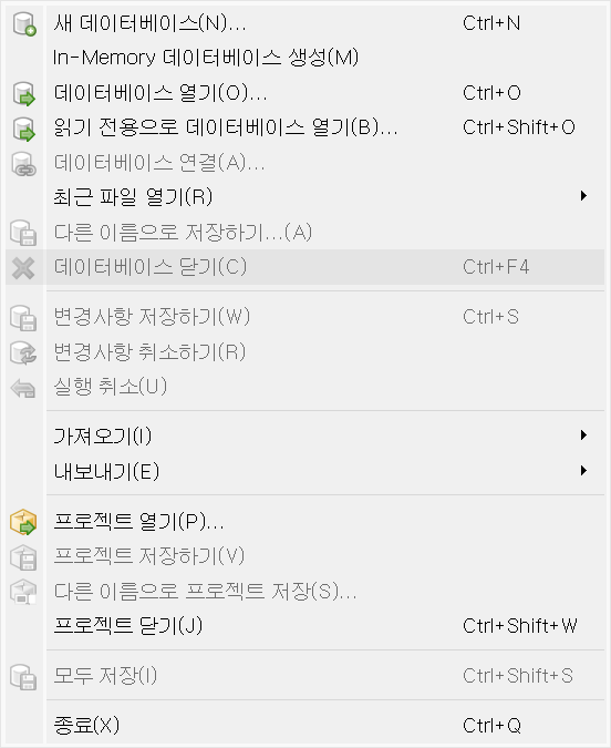 DB Browser for SQLite (앞으로 브라우저라 줄이겠다)를 열면 위와 같은 창이 나타날 것이다. 화면을 보면 알 수 있듯, 한국어를 지원한다! 언어를 바꾸고 싶으면 위의 편집 메뉴에서 환경설정을 클릭하면 된다.