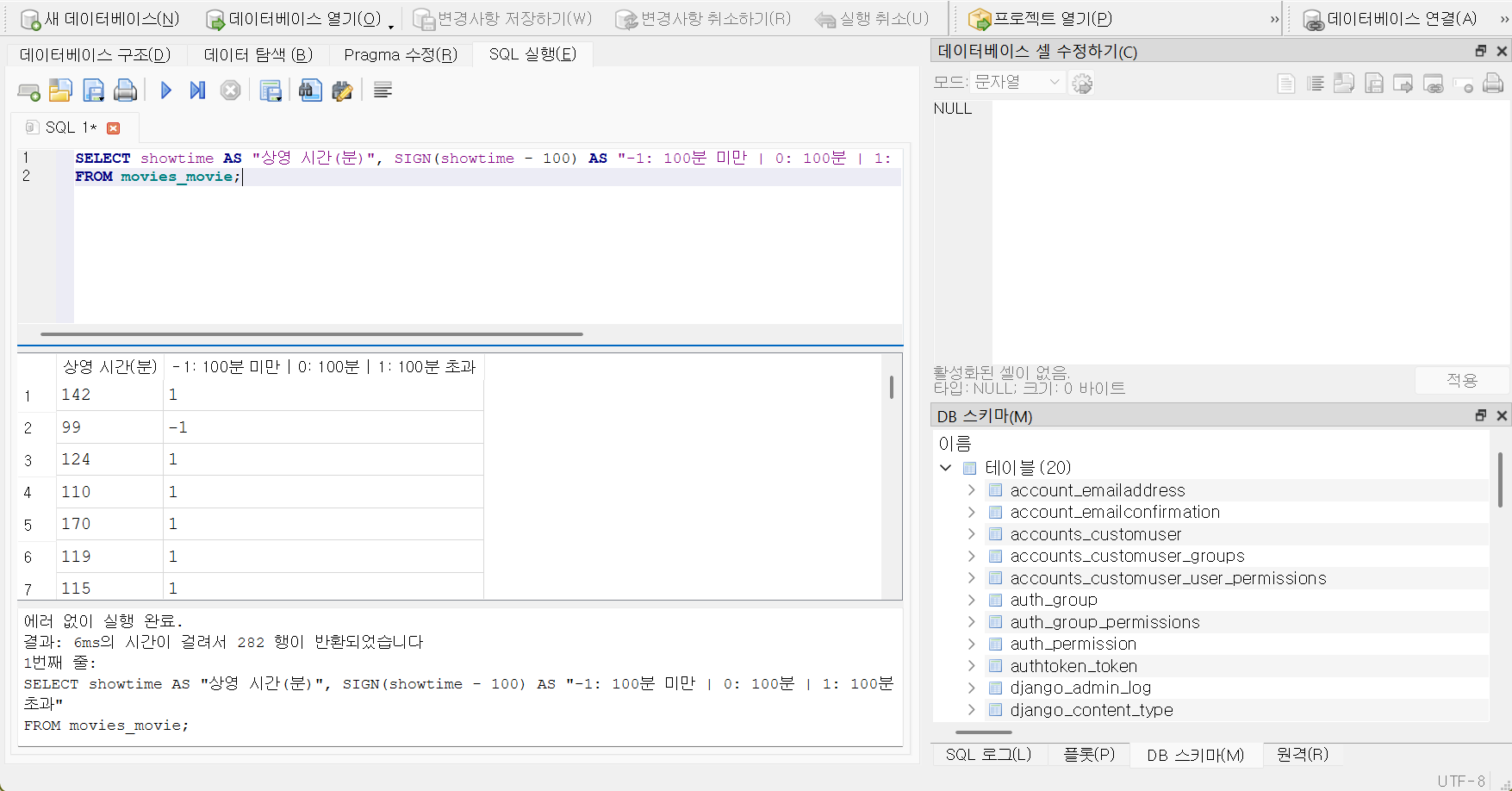 SIGN은 주어진 수가 음수면 -1을, 0이면 0을, 양수면 1을 반환한다. 즉, 부호 정보를 알려주는 함수인 것이다. showtime에서 100을 뺀 후, 그 값의 부호를 바탕으로 상영 시간이 100분 미만인지, 100분인지, 100분 이상인지 출력하는 예시를 하나 만들어 보았다.