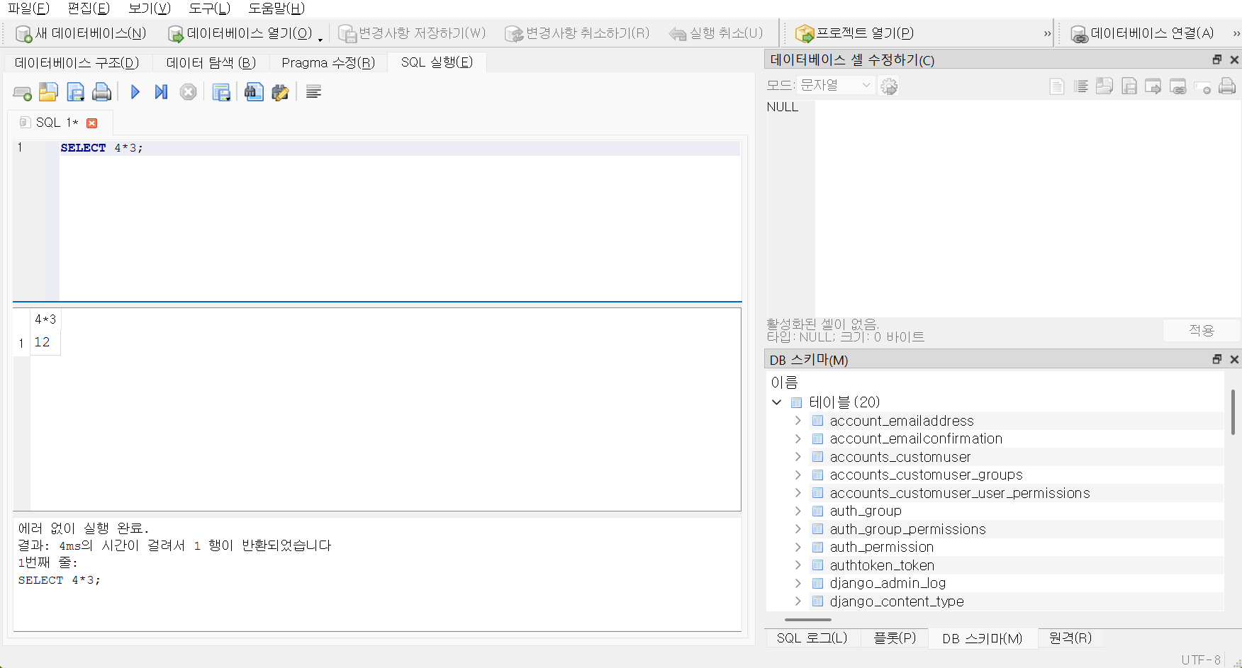 12가 나타난다. 오라클의 경우에는 이럴 때 FROM DUAL로 더미 테이블 DUAL을 사용해야 한다고 하는데, SQLite에서는 굳이 필요없는 듯하다.