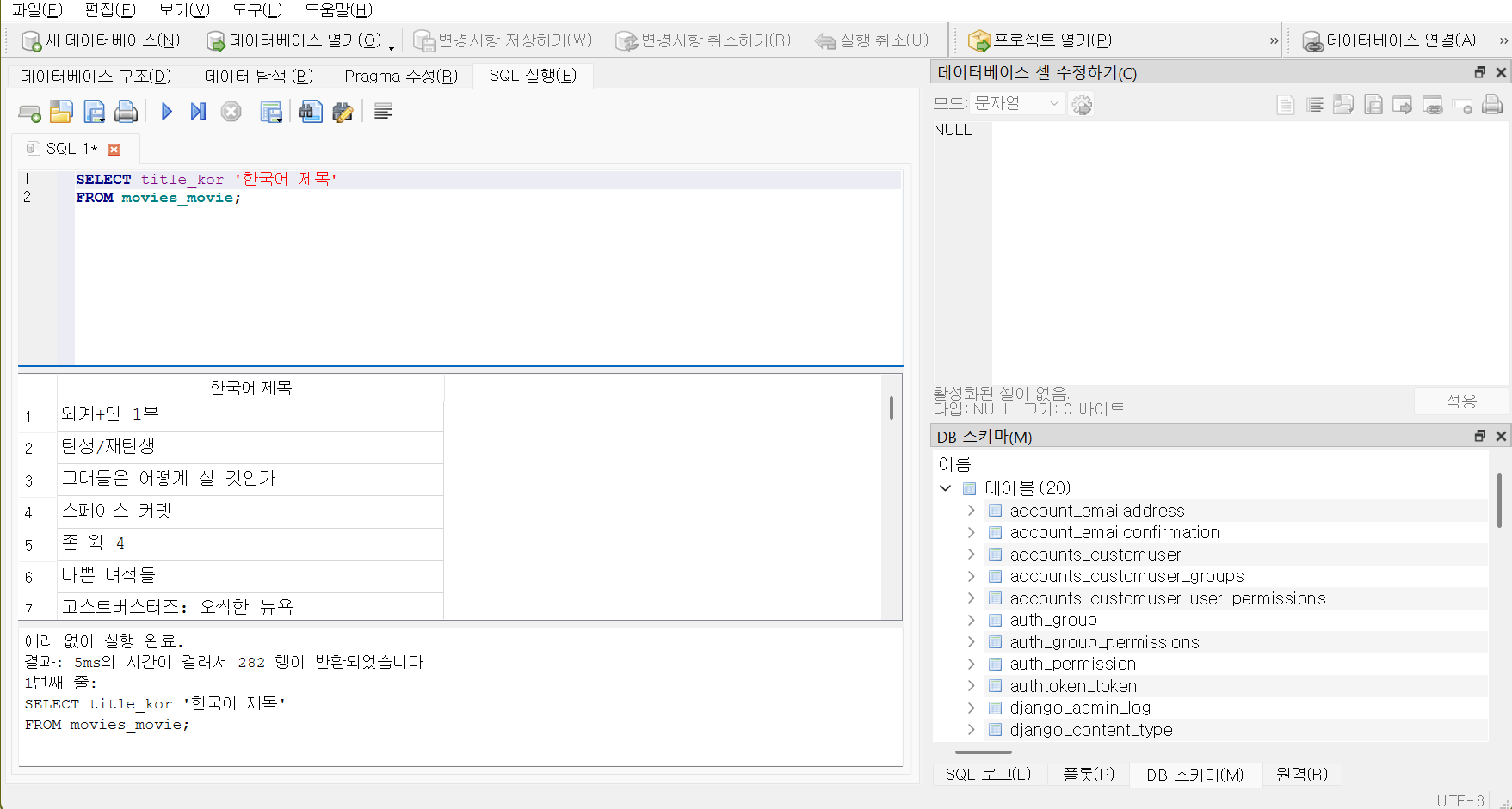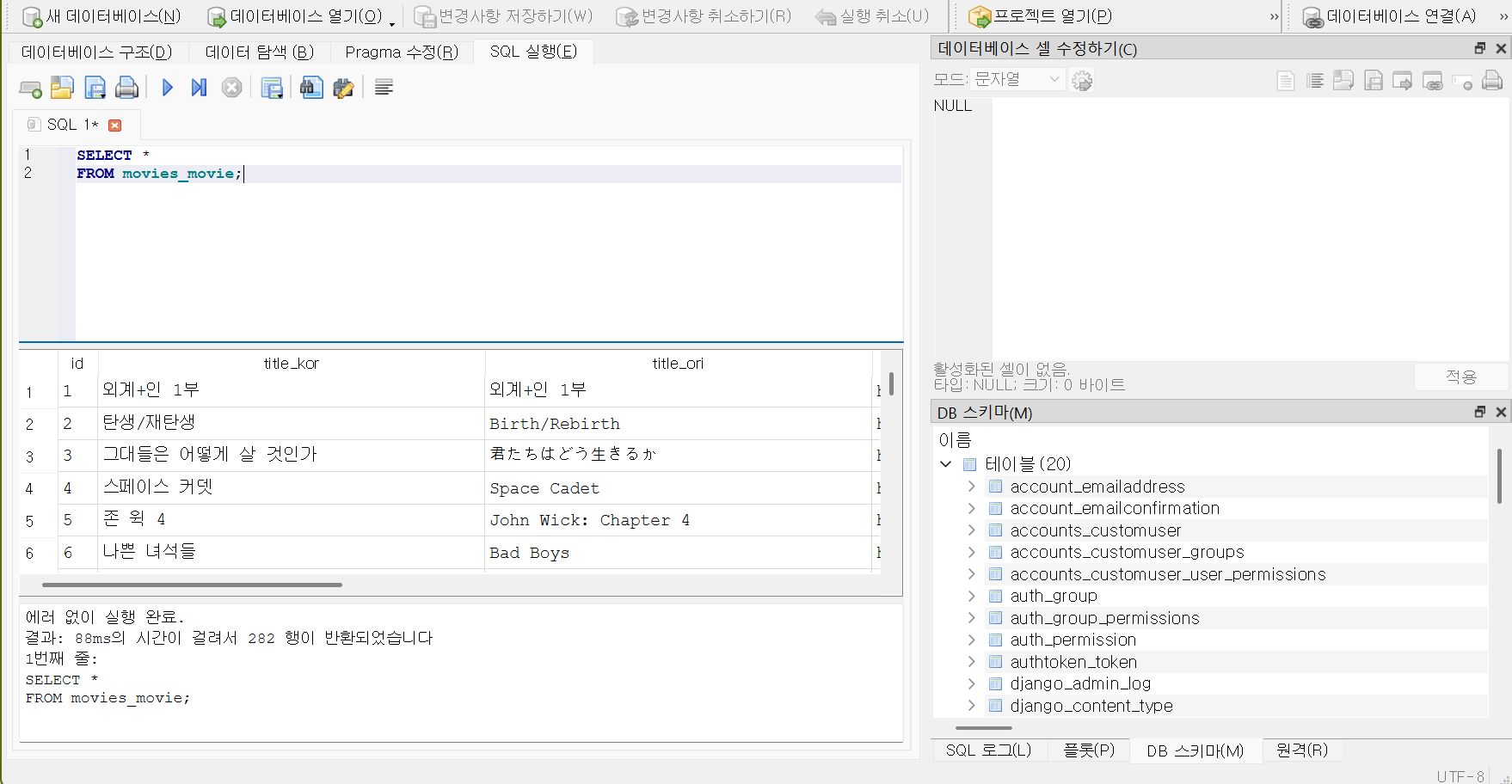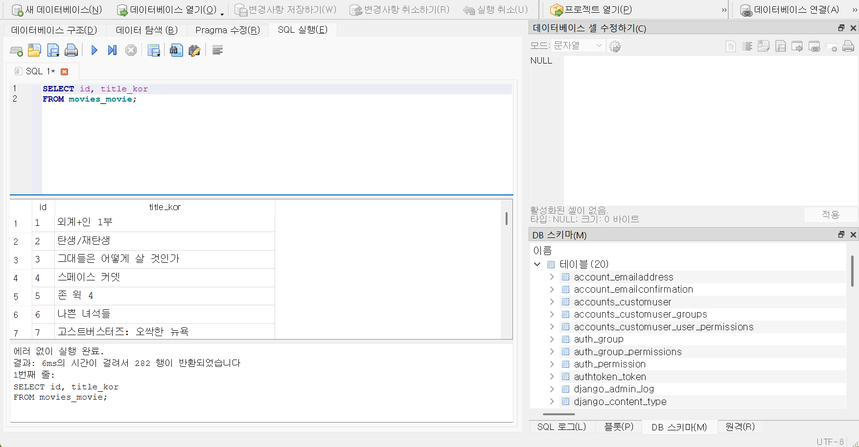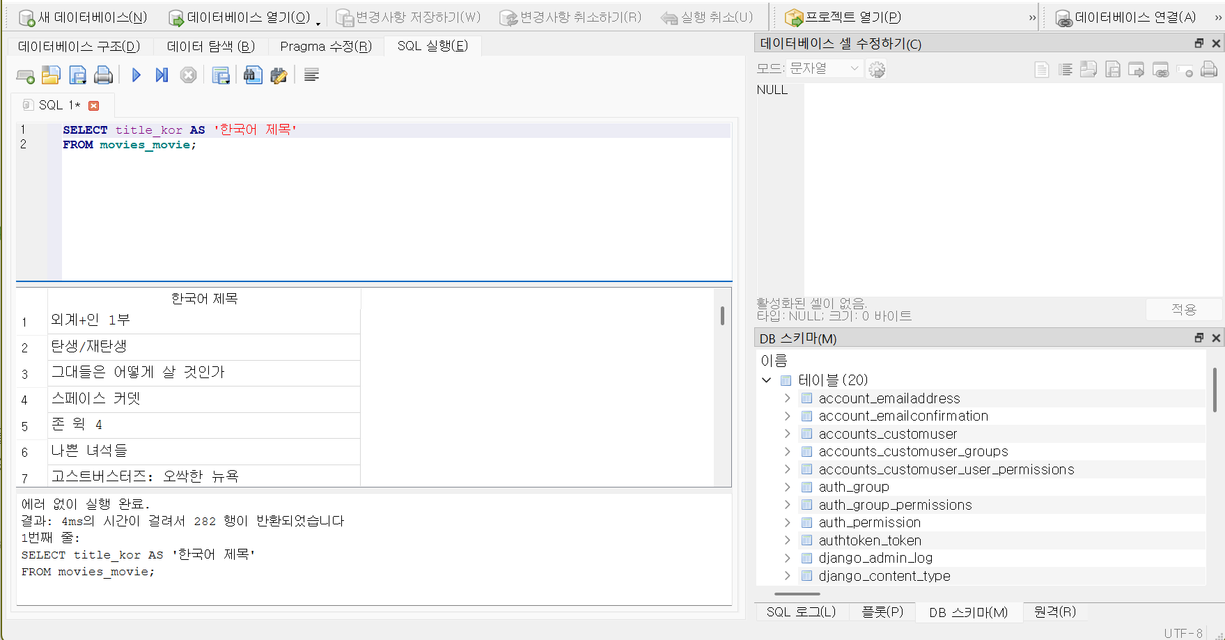 movies_movie 테이블에는 총 282행의 데이터가 있고, 결과창에는 모든 행과 모든 컬럼이 출력되고 있다.