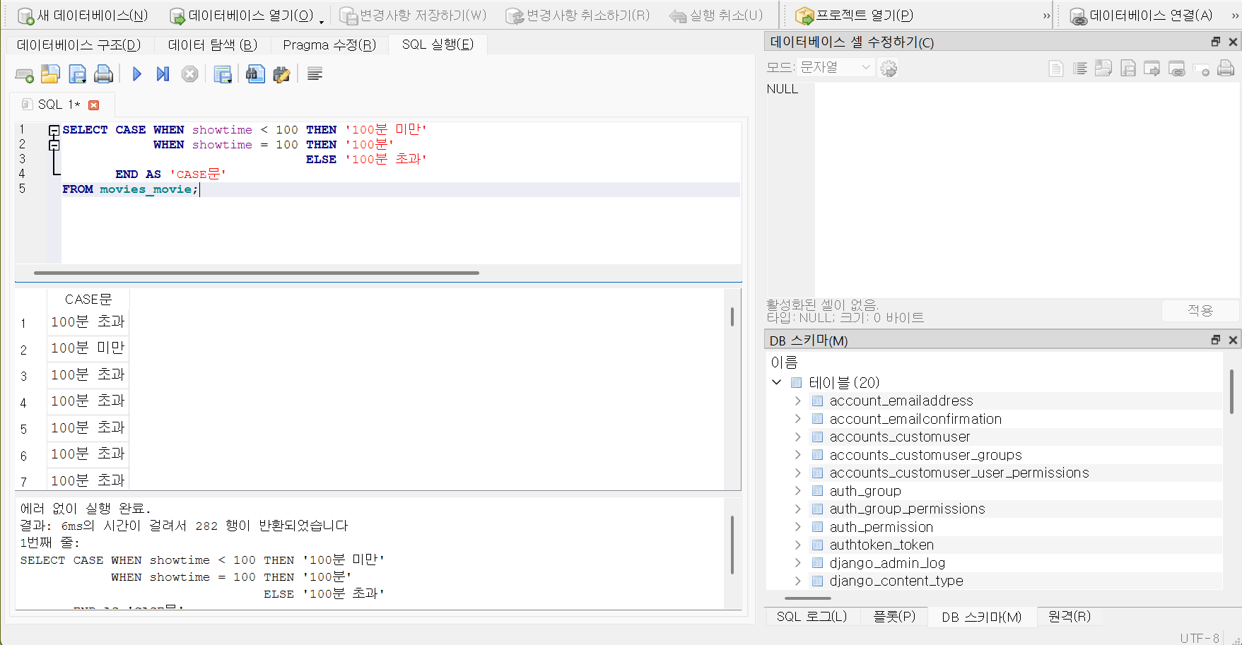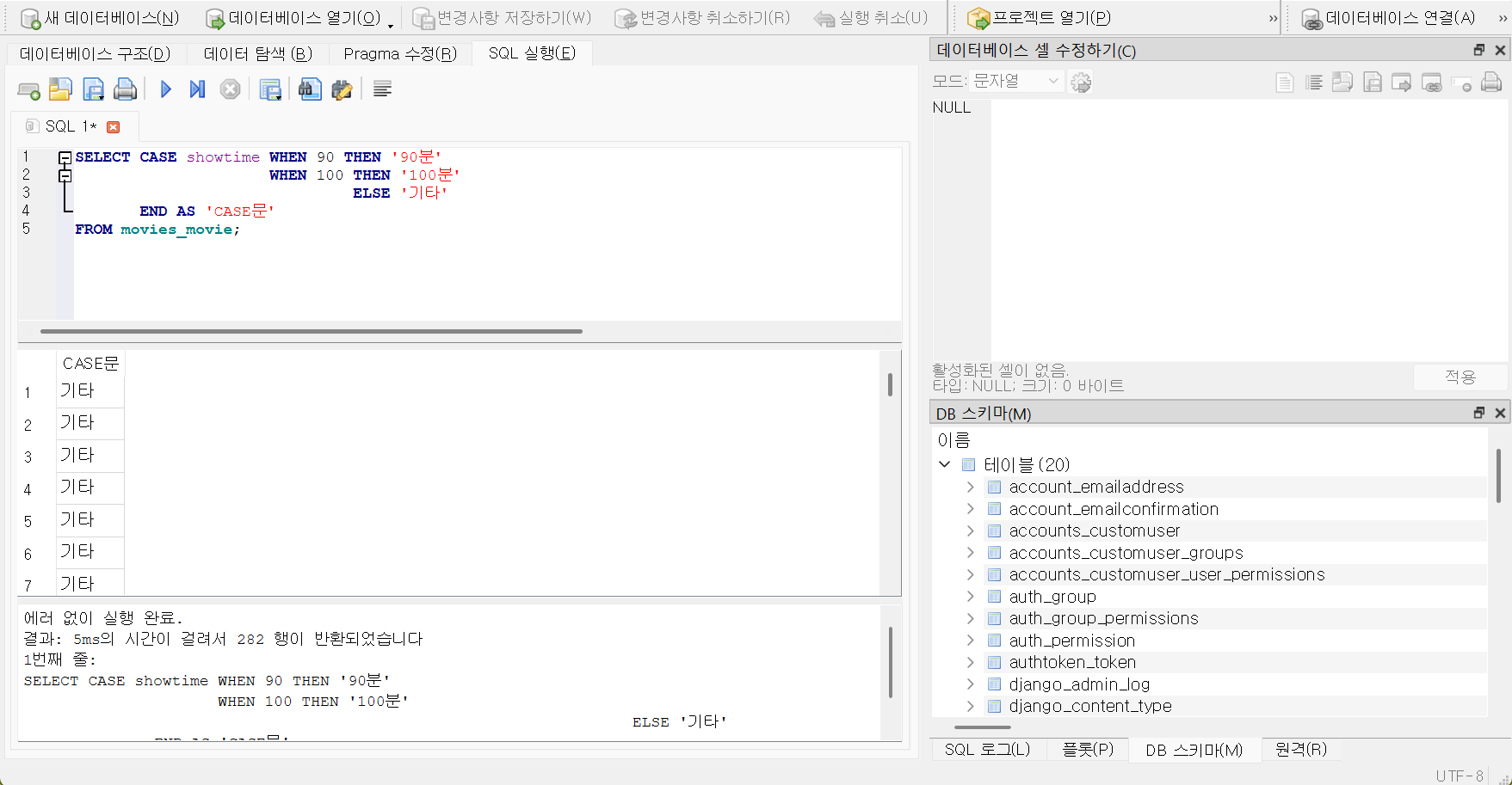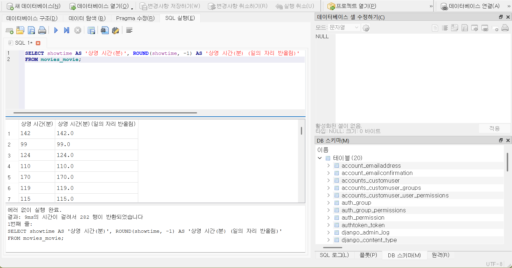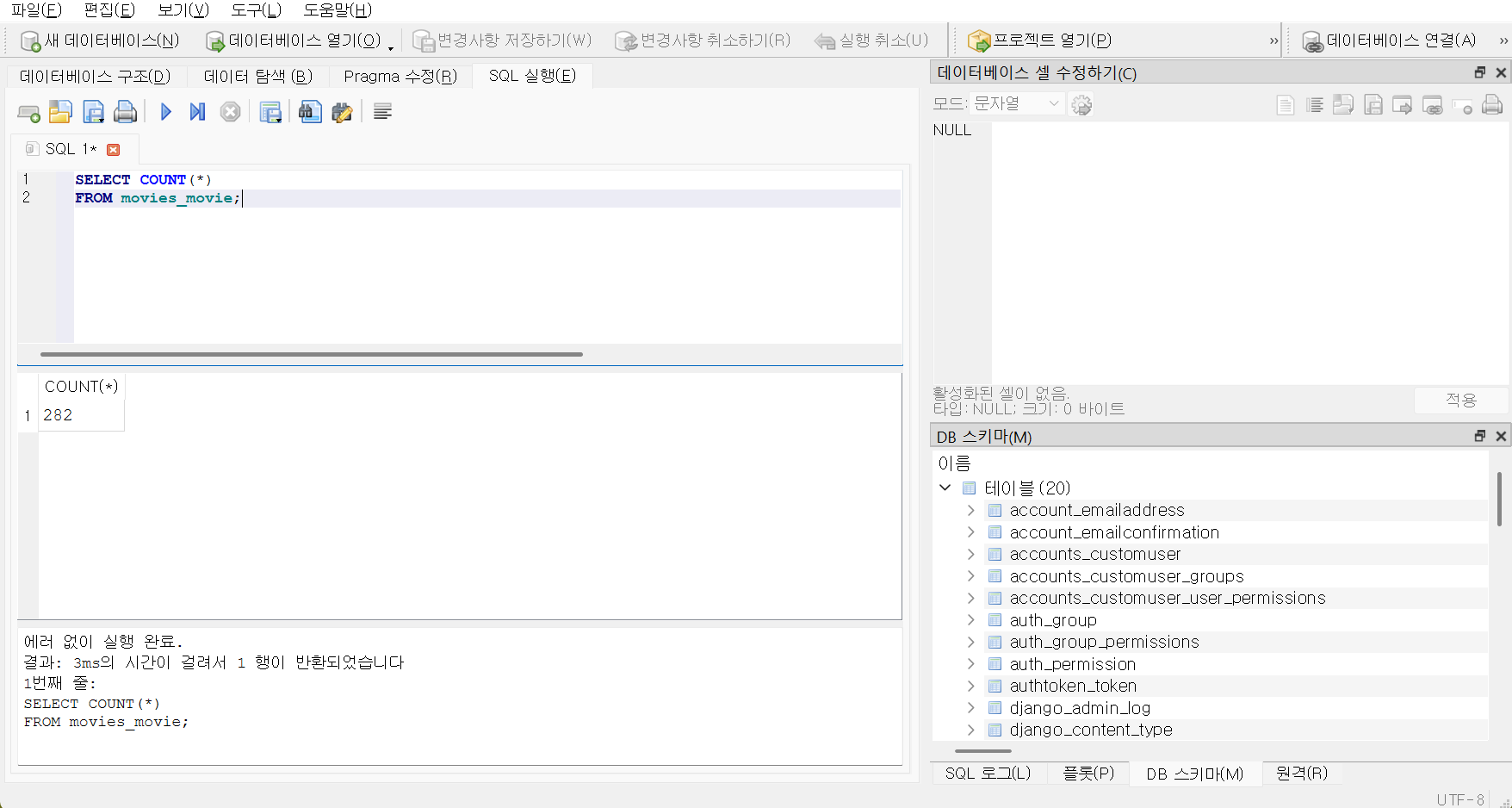 movies_movie 테이블에는 총 282행의 데이터가 있고, 결과창에는 모든 행과 모든 컬럼이 출력되고 있다.