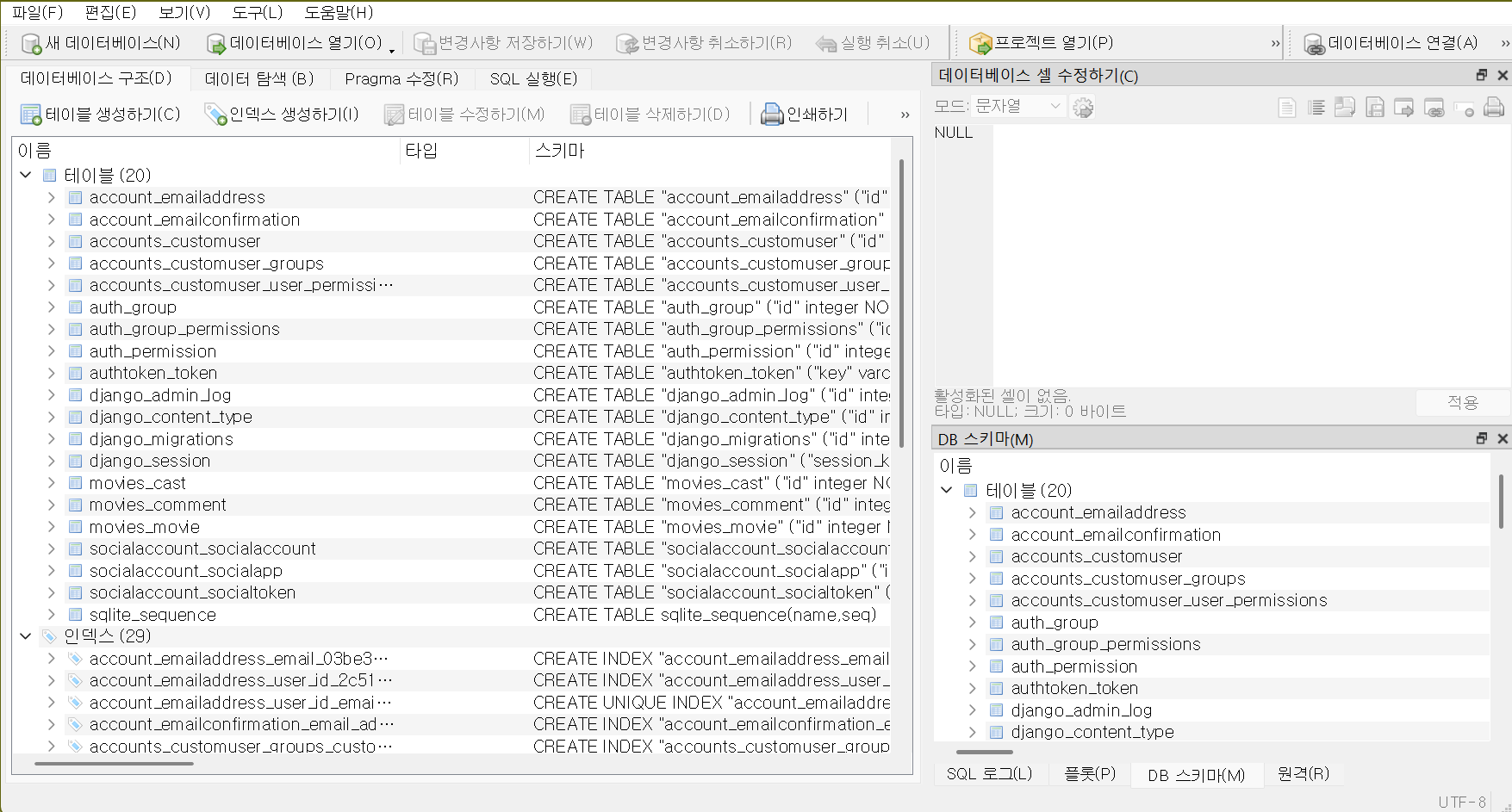 그러면 이와 같이 데이터베이스 구조가 보일 것이다. Django 프로젝트에서 migrate를 통해 만들었던 테이블들과 스키마가 보이고 있다.