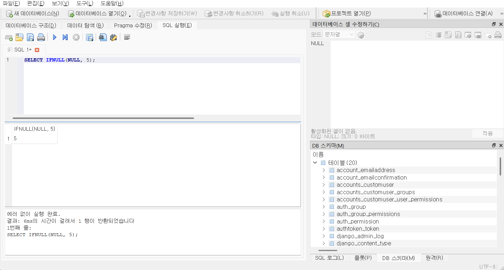 IFNULL은 대상값이 NULL이라면 지정한 값으로 치환하는 함수이다.