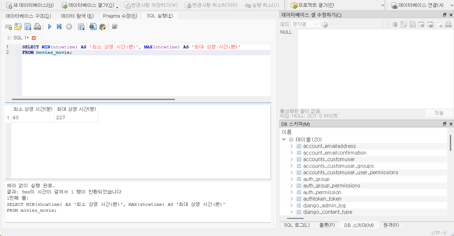 COUNT(*)은 NULL인 데이터를 포함하지만, COUNT(컬럼명), SUM(컬럼명) 등은 NULL인 데이터를 포함하지 않는다. 이 테이블에서는 showtime이 NULL인 행이 없어서 차이가 없지만, NULL인 행이 있다면 차이가 발생할 것이다.