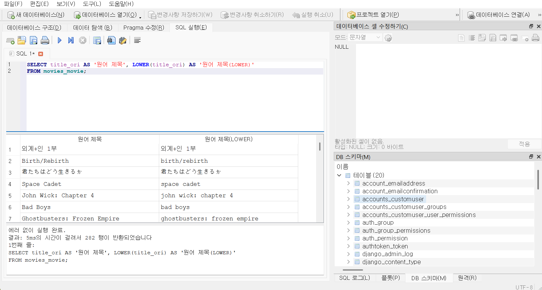 LOWER 함수는 문자열을 소문자로 만드는데, 한국어 제목은 대소문자라는 개념이 없으니, 원어 제목을 사용해 봤다. 비교를 위해 원래의 원어 제목도 나타나게 해 보았다.