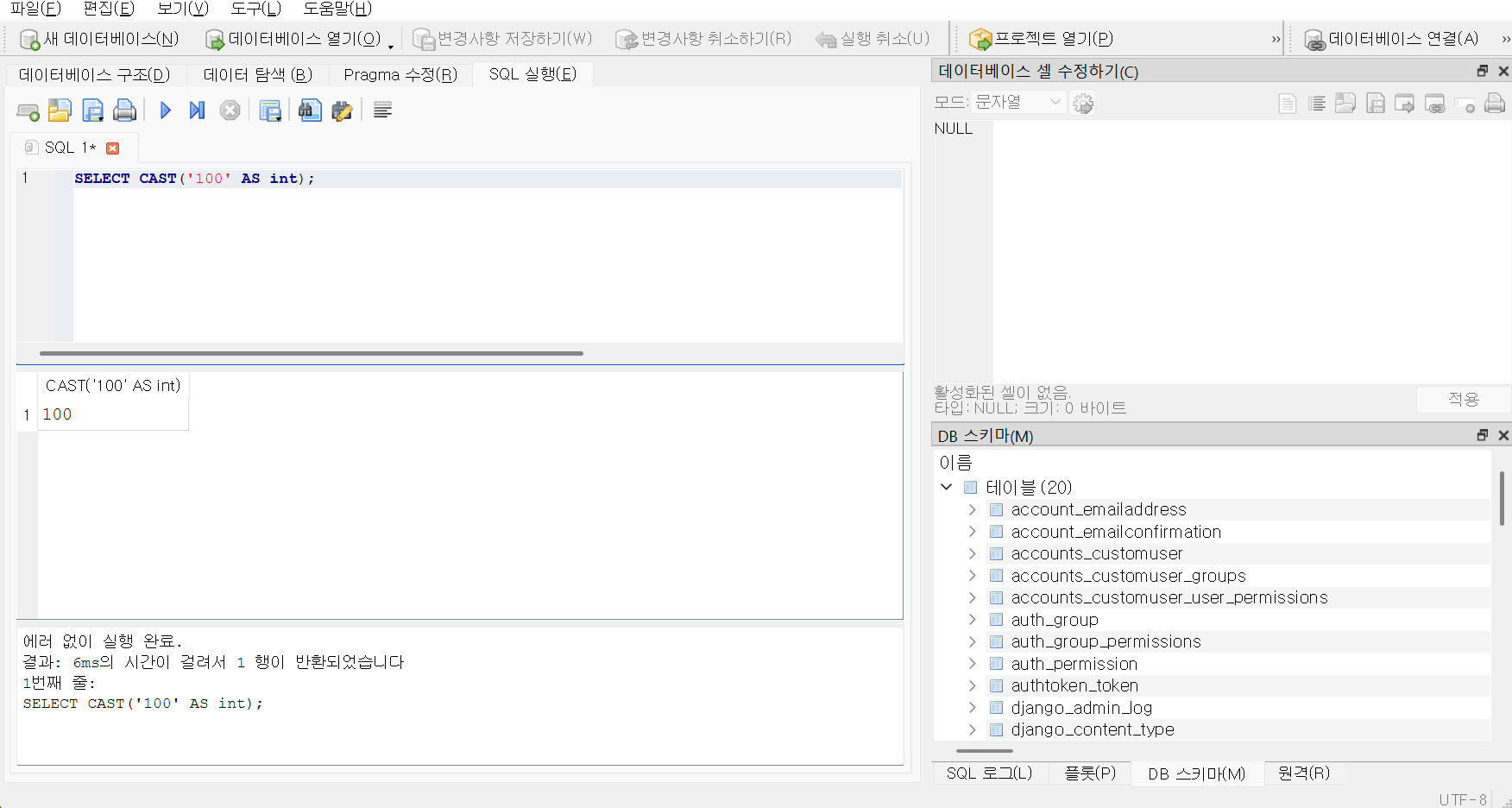 강의에서는 TO_XXX 함수, CONVERT 함수, CAST 함수, FORMAT 함수를 알려줬는데, SQLite에는 TO_XXX, CONVERT 함수가 없고, CAST만이 존재한다. 그리고 FORMAT은 FORMAT('%.2f', 2.5363)처럼 문자열 포매팅을 위한 함수로 쓰이고 있다.