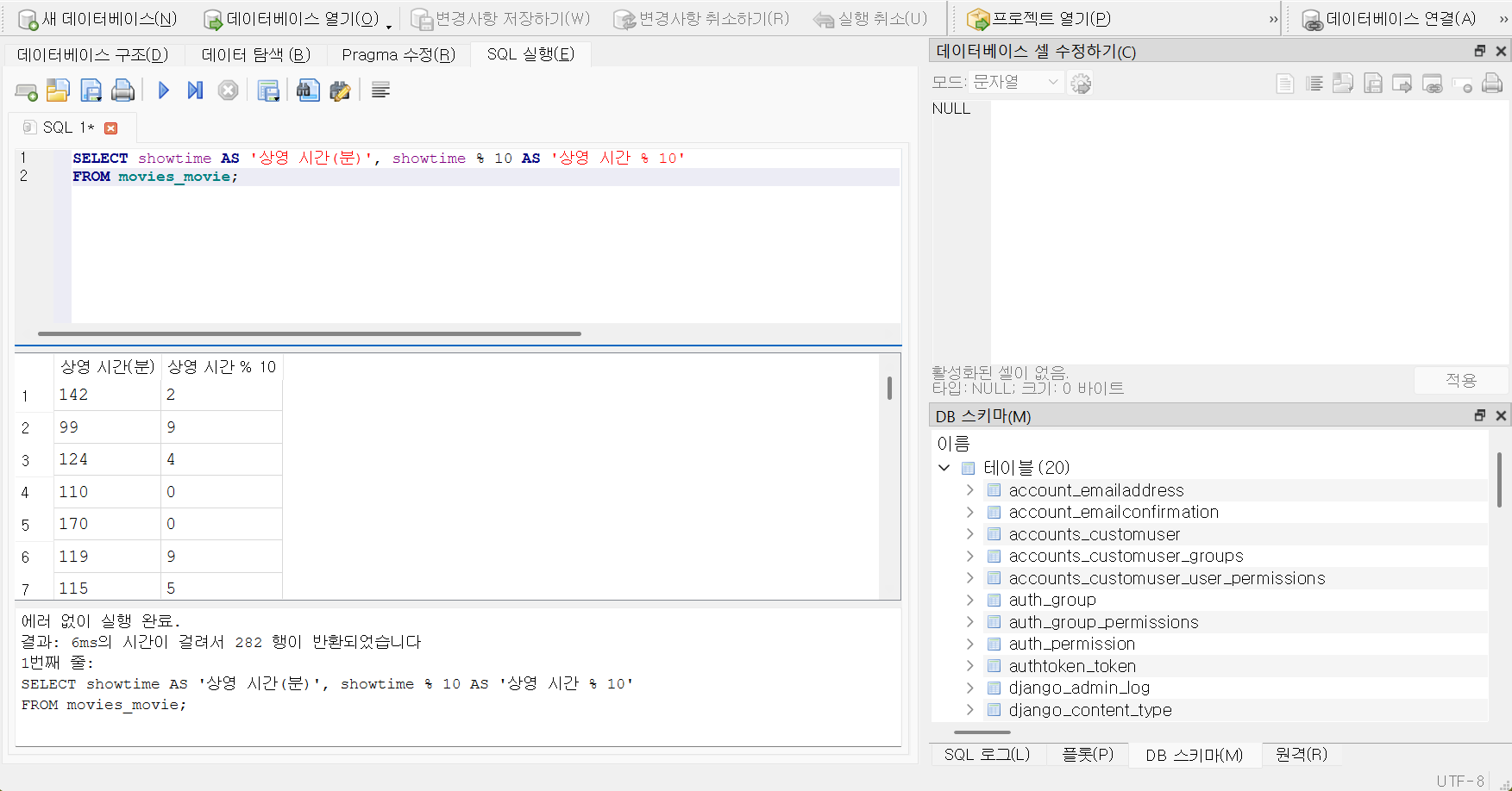 SELECT showtime AS '상영 시간(분)', showtime % 10 AS '상영 시간 % 10'