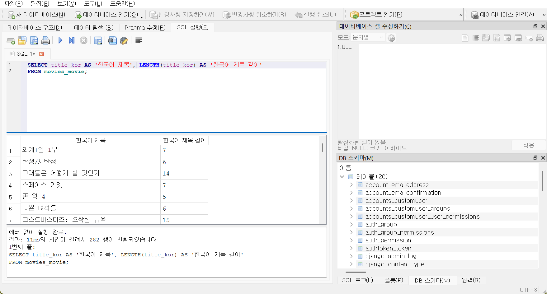 SELECT title_kor AS '한국어 제목', LENGTH(title_kor) AS '한국어 제목 길이', LENGTH(REPLACE(title_kor, ' ', '')) AS '한국어 제목 길이 (공백 제거)'
