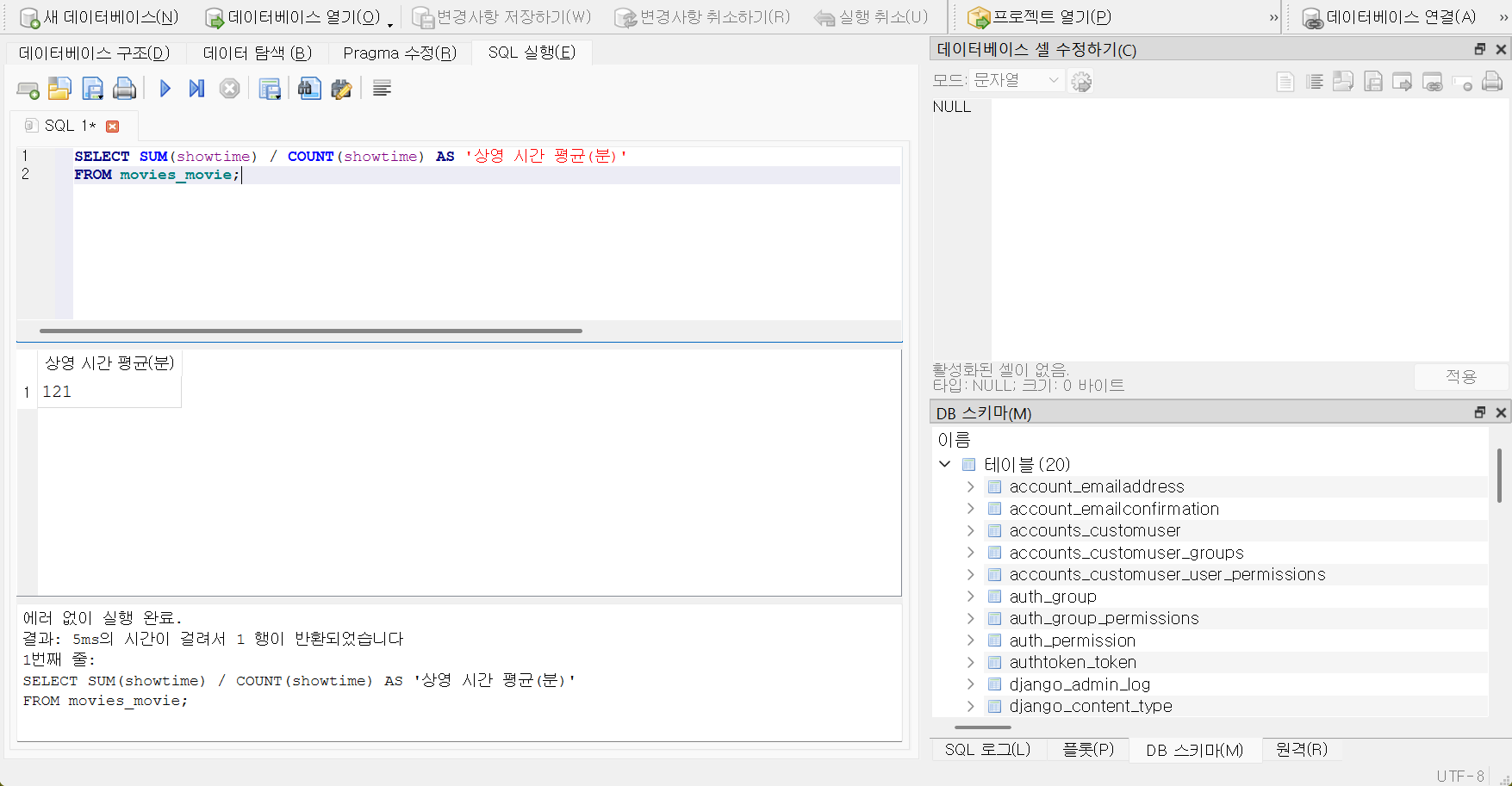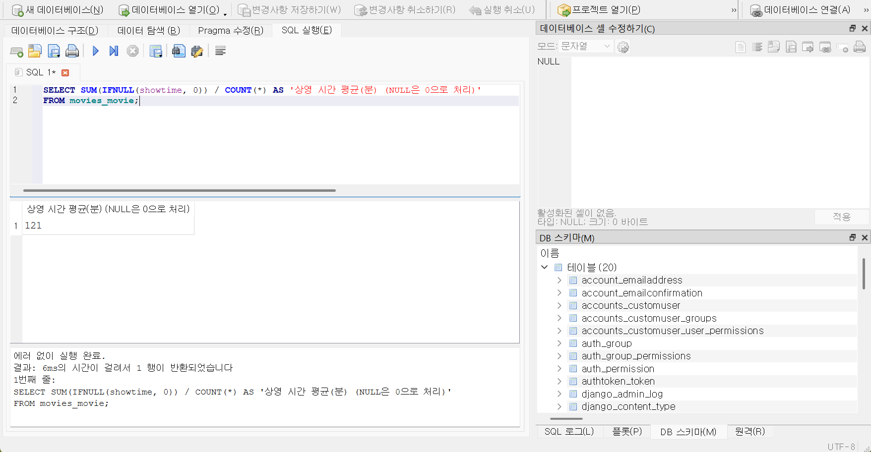 IFNULL은 밑에서 다룰 것이지만, NULL인 값을 치환하는 함수이다. NULL을 0으로 처리해서 상영 시간의 평균을 구해봤다.