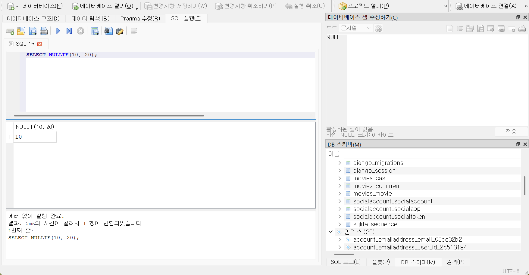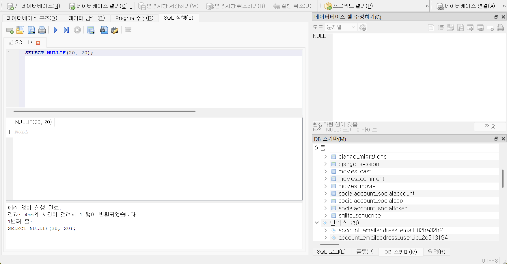NULLIF는 두 인수가 같으면 NULL을, 그렇지 않으면 첫번째 인수를 반환한다.