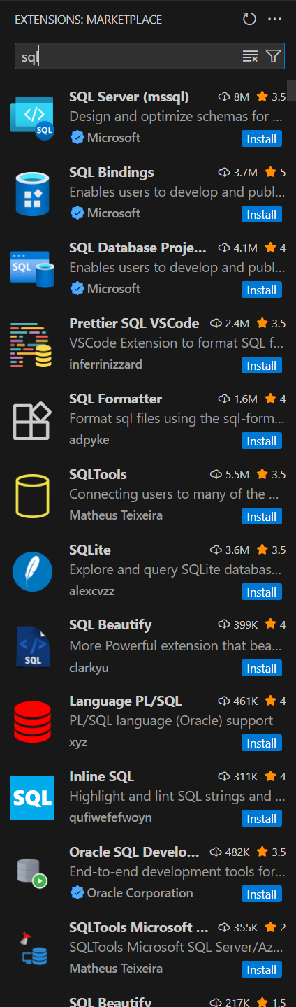 VS Code의 마켓플레이스에서 SQL이라는 키워드로 확장 기능을 검색해보면, 다양한 SQL 포매터를 볼 수 있다. 확장 기능의 설명과 기능을 잘 보고, 마음에 드는 것을 하나 설치하면 될 것 같다. 나는 아직 VS Code로 SQL 코드를 쓸 일은 없어서 확장 기능 설치나 사용은 해보지 않곘다.