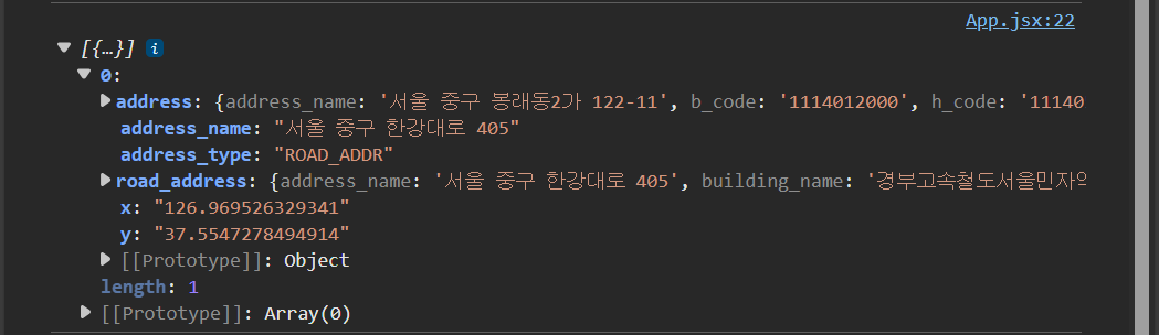 주소를 좌표를 변환하려면 addressSearch 메소드를 사용하면 된다. 한 번 주소를 좌표로 변환해보자. 아까 부분에서 다시 then 메소드를 사용해서 진행한다.