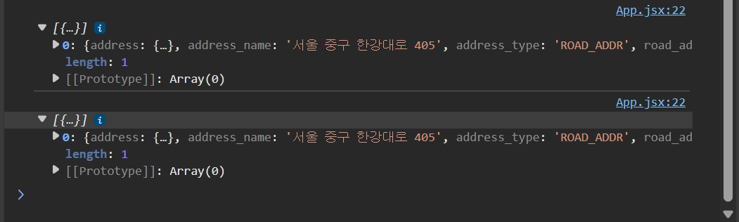 콘솔에 이렇게 검색 결과가 출력되는 것을 볼 수 있다. 두 번 출력되는 것은 리액트의 Strict 모드 때문이다.