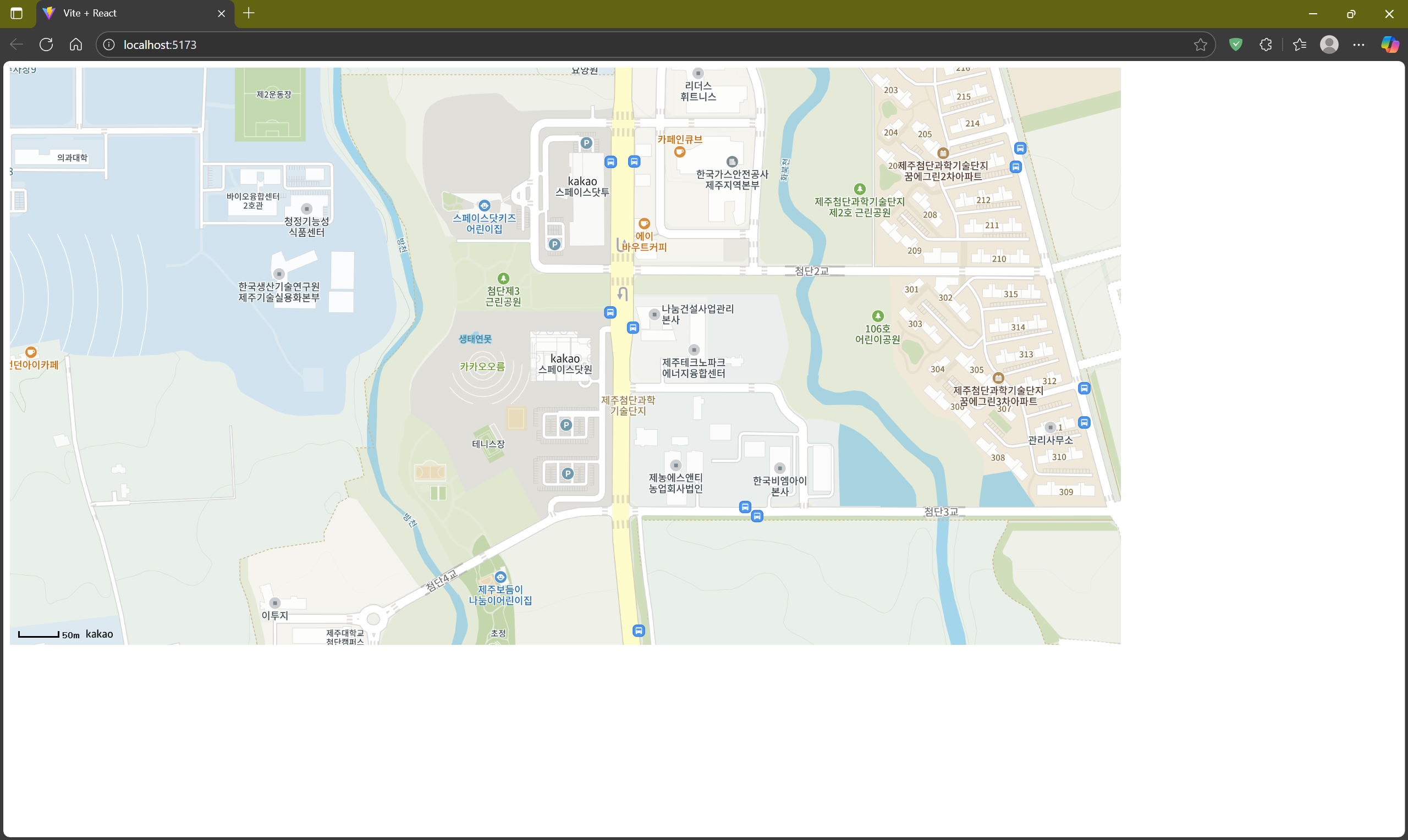 지도 삽입을 위해 노드 지정하고, 거기에 옵션 만들고, 지도 객체 생성까지 해야 했던 아까를 생각하면 훨씬 간단하고 편리해졌음을 느낄 수 있다! react-kakao-maps-sdk에서 Map 컴포넌트 하나만 불러오면 끝난다!