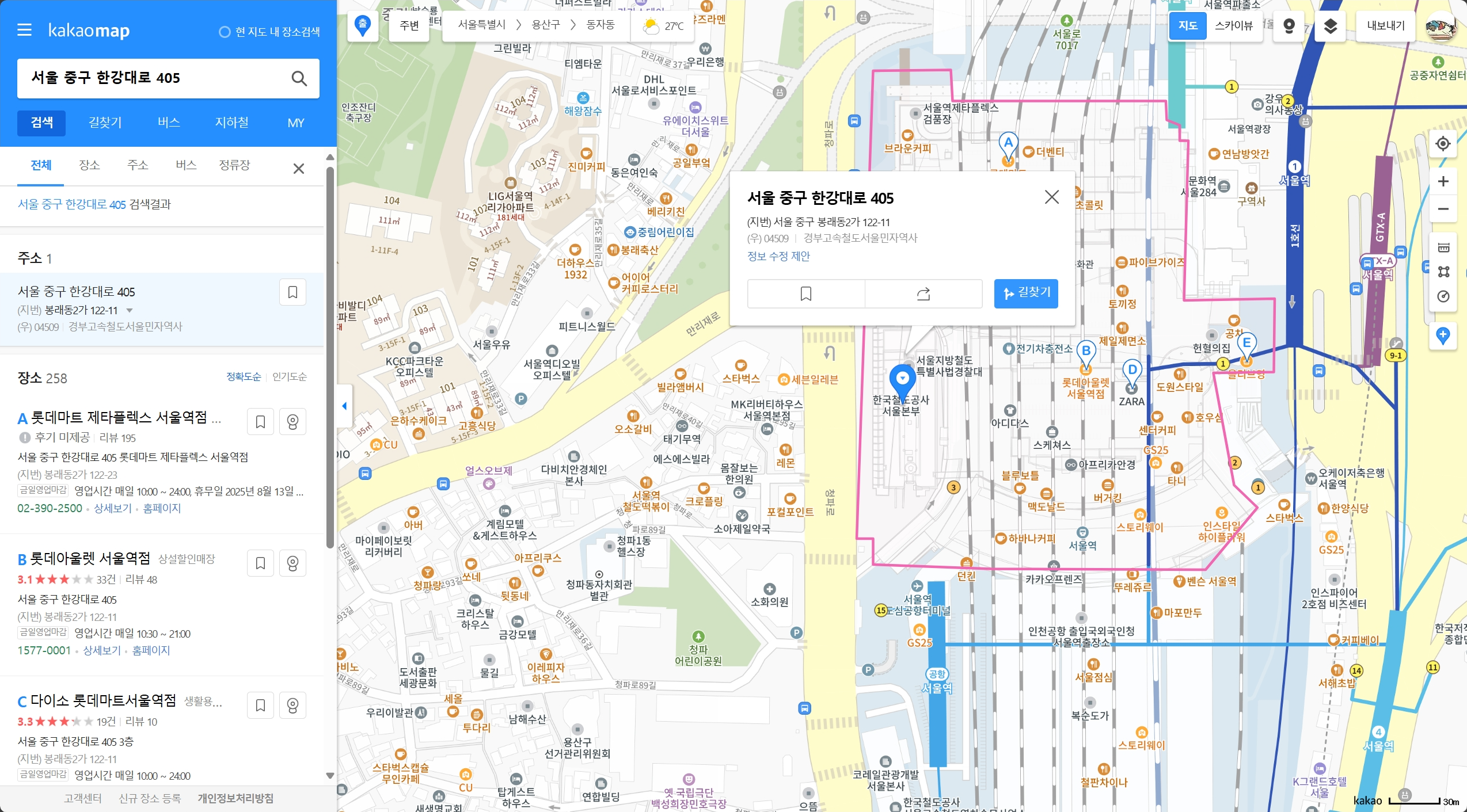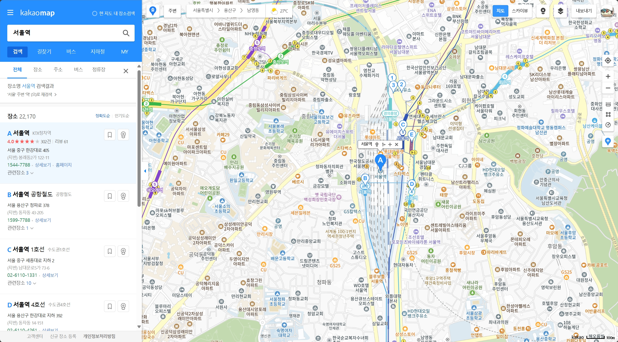 먼저, 서울역의 지명은 서울 중구 한강대로 405이다. 카카오맵에서 이 지명을 그대로 검색해보자.