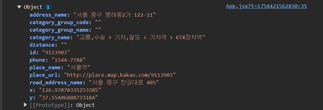 장소 검색에는 kakao.map.services.Places 객체를 사용한다. 한 번 서울역을 검색해서 첫 번째 결과의 정보를 콘솔에 출력해 보자.