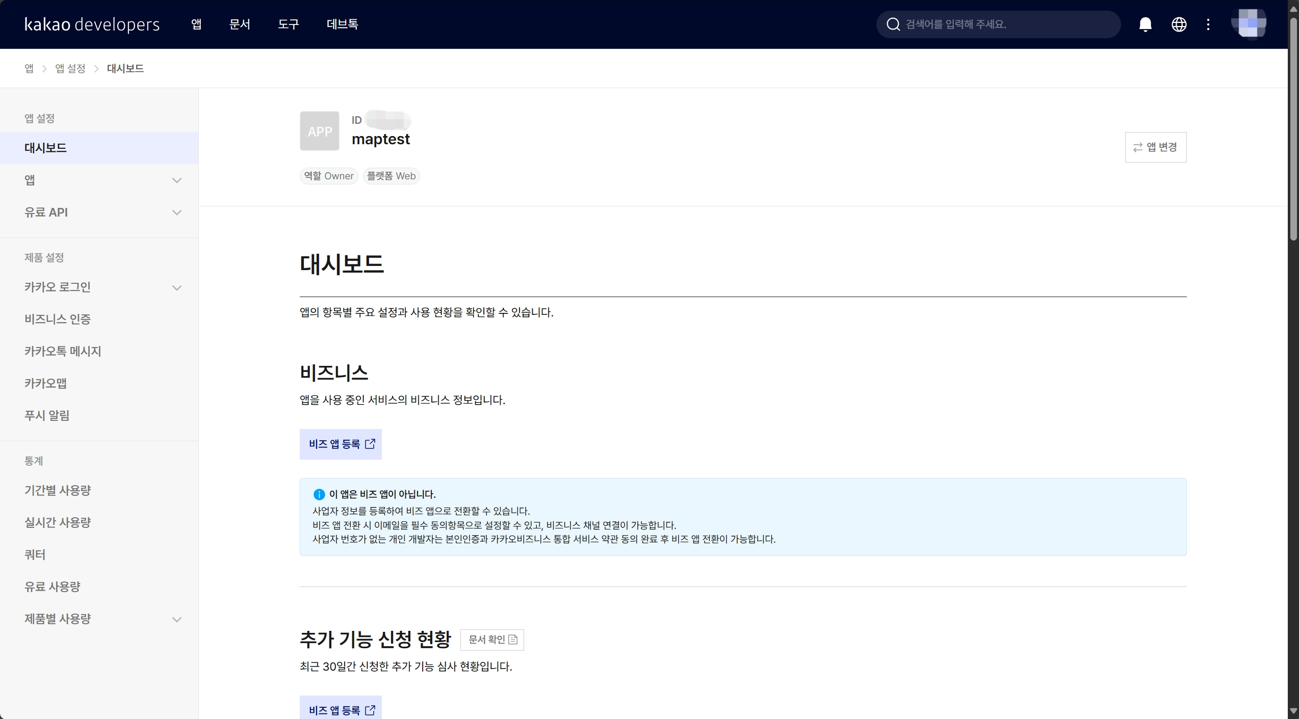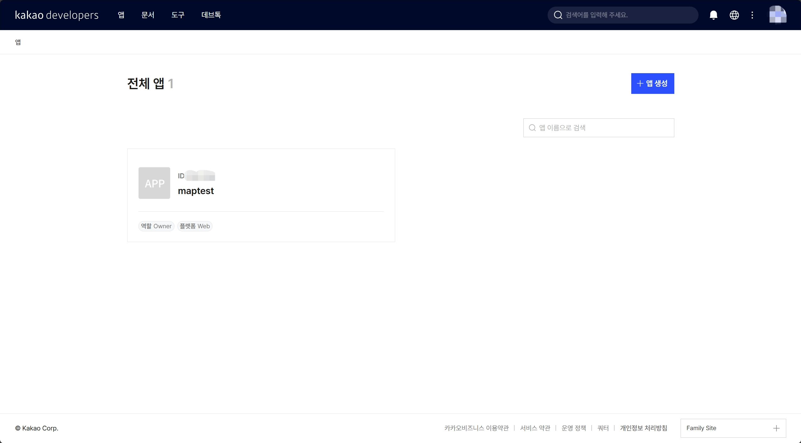 상단의 앱을 클릭하면 전체 앱이 뜨는데, 나는 이미 테스트를 해보며 앱을 하나 생성해 둔 상태이다. 앱이 없다면 앱 생성을 클릭해서 앱을 생성해준다.