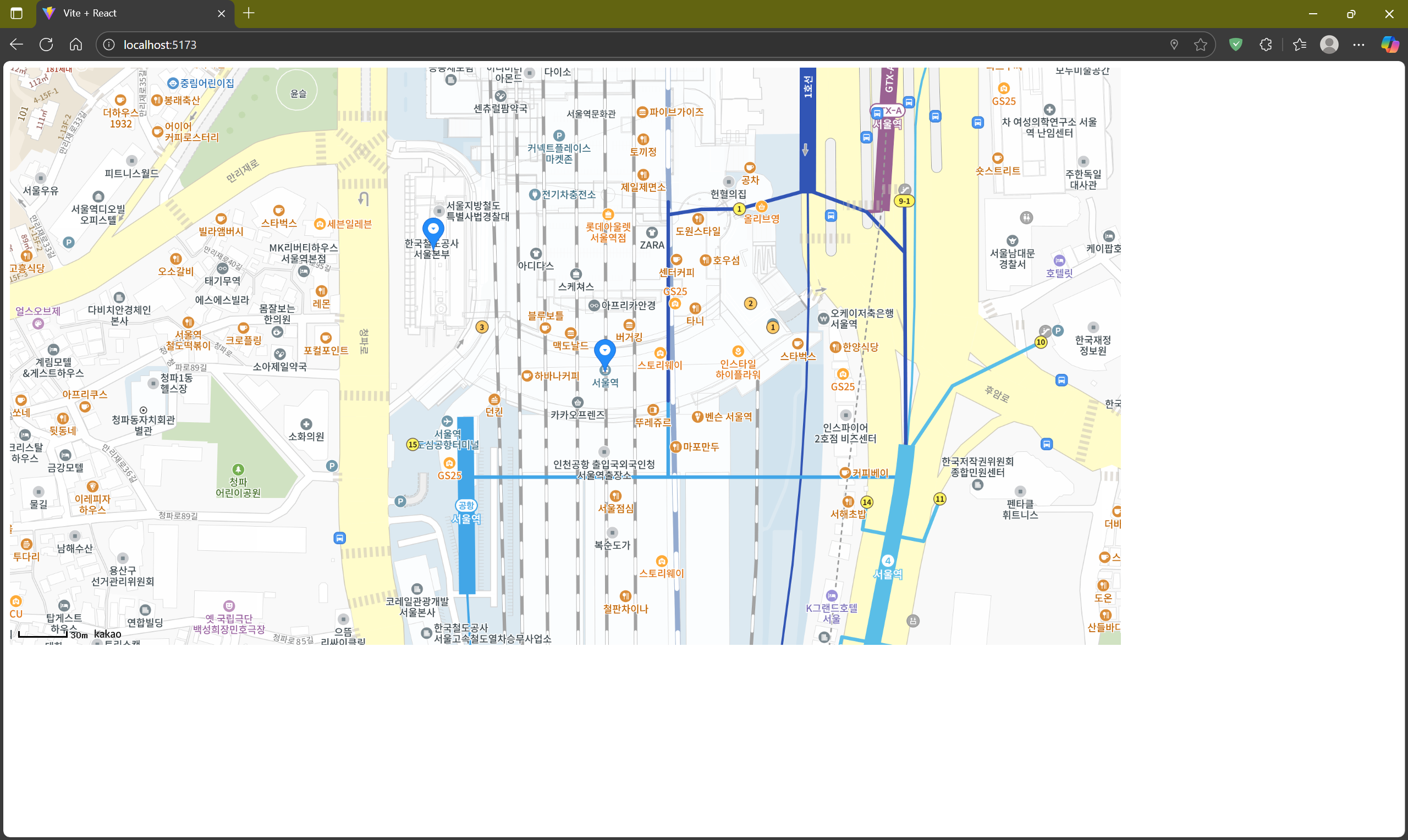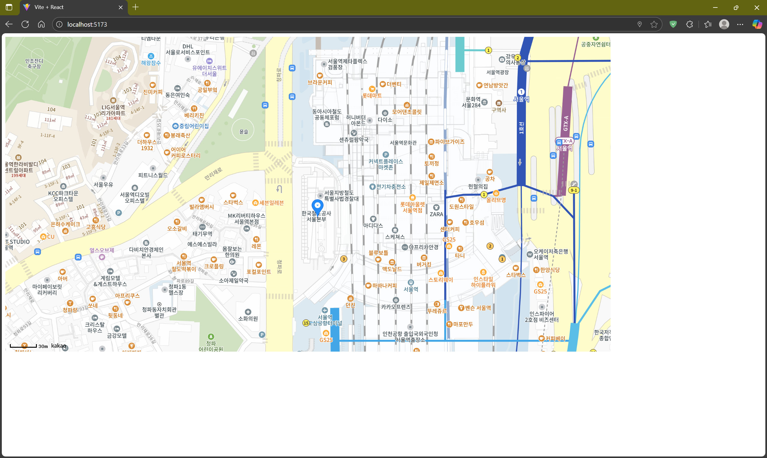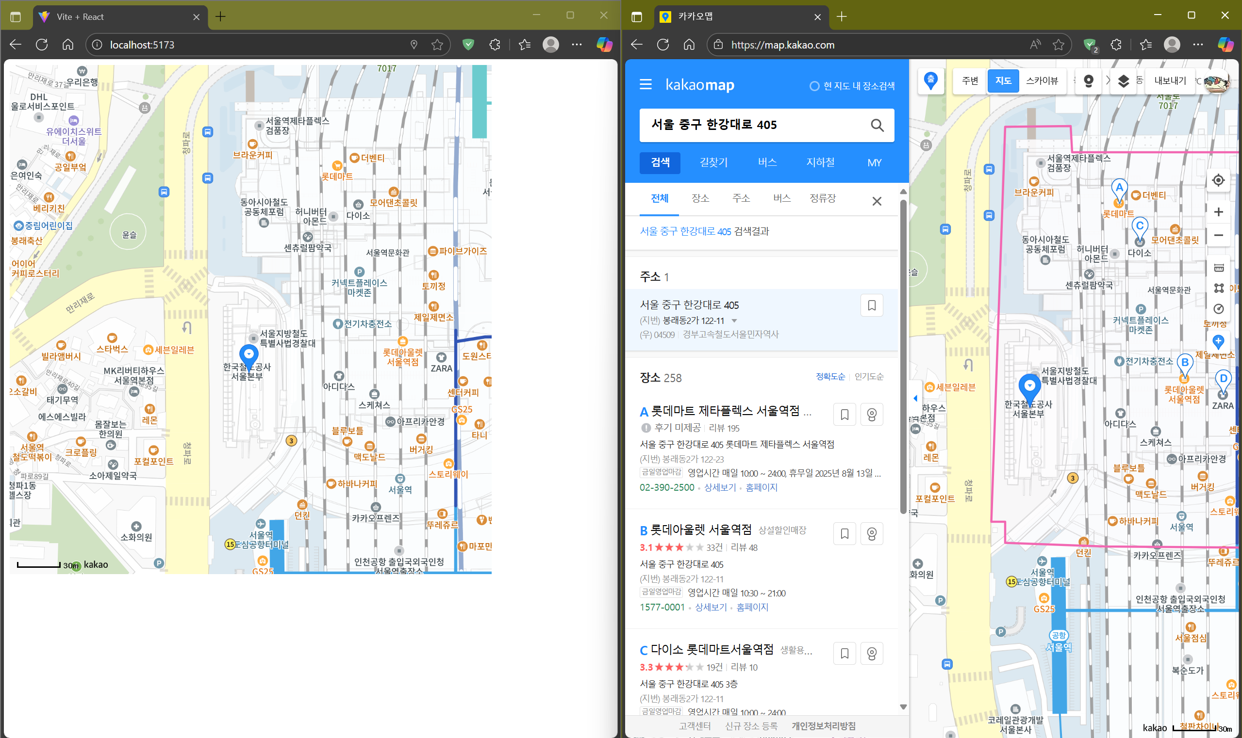 이렇게 서울 중구 한강대로 405 위치에 마커가 찍힌 것을 볼 수 있다.