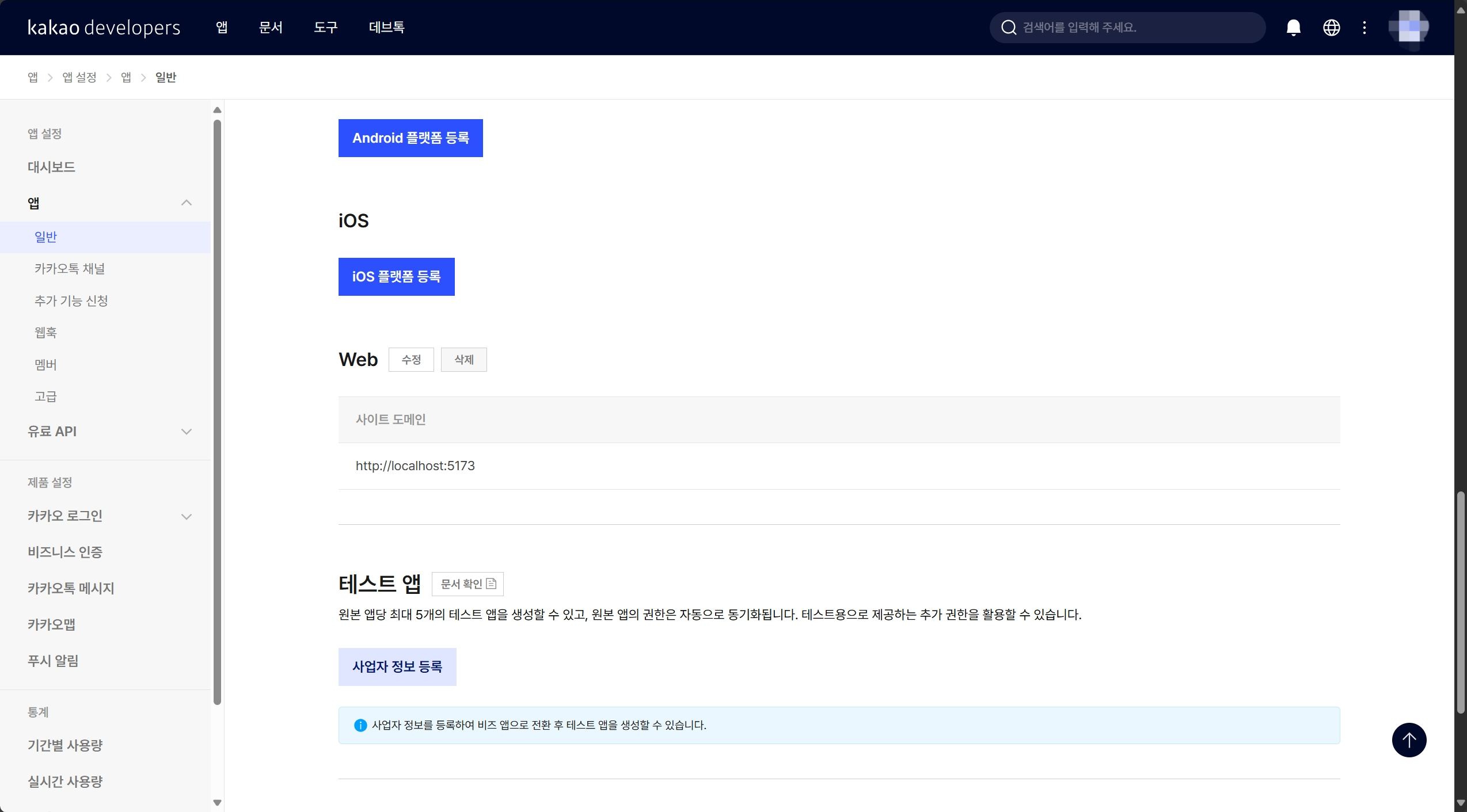 그리고 한 가지 세팅을 더 해야 한다. 테스트에서 사용될 주소(http://localhost:5173)를 플랫폼에 있는 웹 부분의 사이트 도메인에 추가해주는 작업이 필요하다. 사이트 도메인에 추가되어 있는 주소에서만 API를 사용할 수 있기 때문이다.