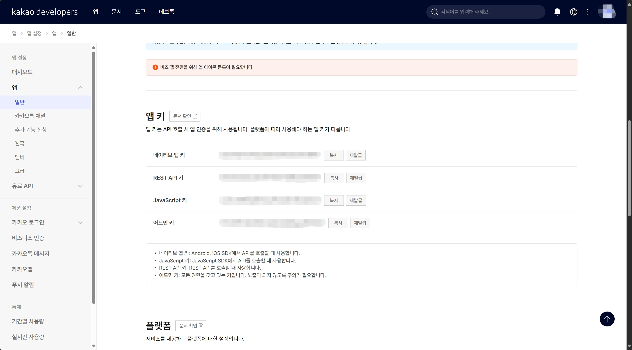 밑으로 내리면 이렇게 앱 키라는 것이 있을 것이다. 이번 실습에서는 자바스크립트 키를 이용하게 된다.