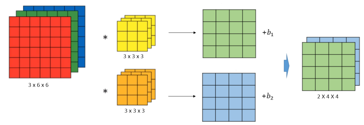 그림에서 본 것처럼, 만약 input data가 3x6x6이면, 3x3x3의 filter가 2개가 있고, 그럼 각각 4x4의 output 값이 나오고,그게 2개니깐 그럼 2x4x4의 output이 만들어짐