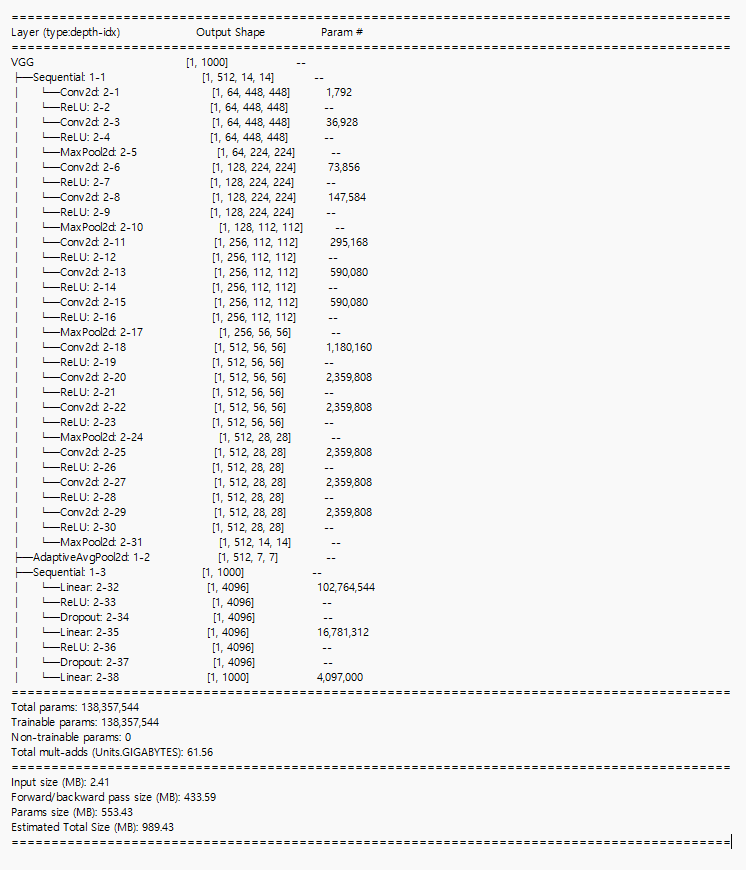이 모델은 아래 summary를 보면 covolution&Relu를 두번씩 하고 나면, Max-pooling을 해서 size를 줄이는 구조를 5번 반복한 뒤에 adaptive_average pooling을 하는데 이건 output_size를 (7,7)로 맞춤. 여기서는 Global Average Pooling을 쓰는 대신 adaptive average pooling으로 장치를 하나 만들어주었는데, 그건 바로 classifier에 넣기 전에 output size를 무조건 7x7로 맞춰주기 위해 넣어둠. 즉, 각 데이터의 크기가 다를 수 있기 때문에 무조건 그걸 분류기랑 맞춰주기 위해서 장치를 하나 넣어둠