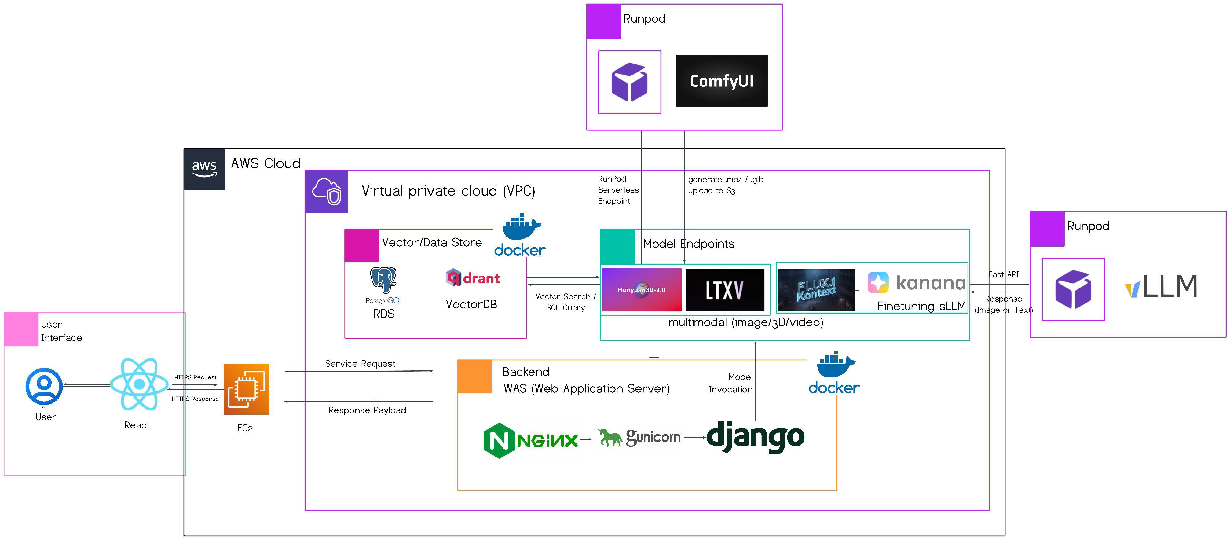 우리의 전체 시스템 아키텍처는 아래와 같다. EC2 서버에 올려서 서비스를 배포하게 되는데, 특히 파인튜닝된 모델이나 이외에 다른 모델들을 활용할때는 vLLM endpoint를 활용해서 Runpod에서 모델을 서빙하면 그 모델들을 url 형태로 가져와서 사용할 수 있다.파인튜닝된 Kananaa모델과 Flux 모델은 vLLM 엔드포인트로 연결하고 나머지 3D와 비디오 모델은 백엔드가 ComfyUI (Runpod Serverless Endpoint)를 호출하도록 설계했다. 그리고, 작업 안료 후 산출물(mp4/glb/이미지)을 S3로 업로드하여 저장하도록 하였다.