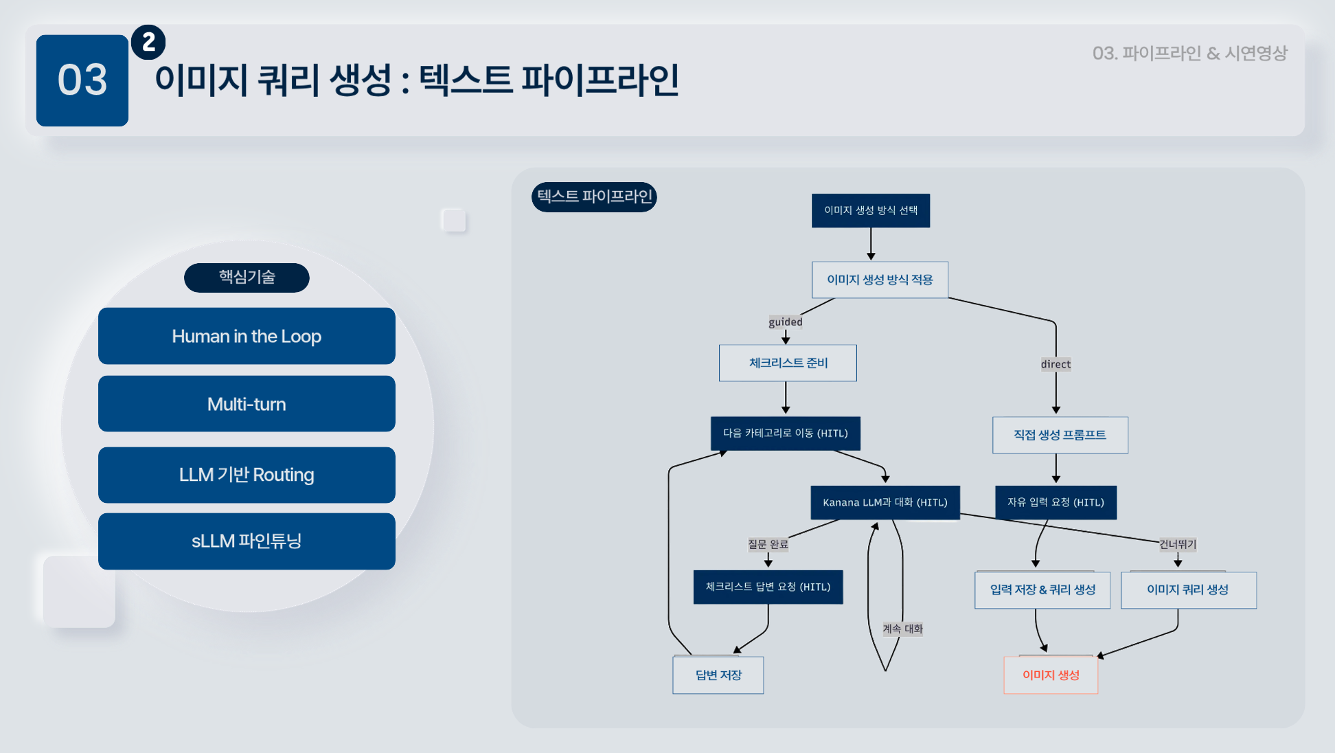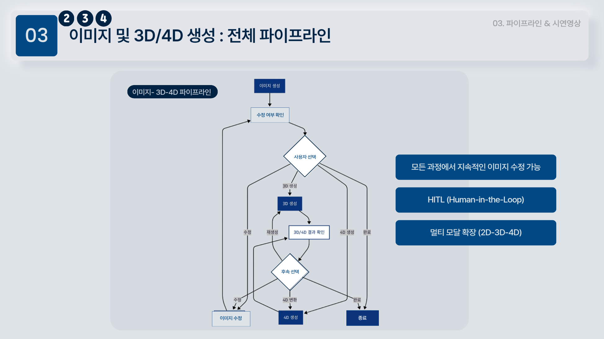 이미지 파이프라인의 경우 수정여부나 어떤 2D, 3D 혹은 video인지에 따라 HITL 방식을 똑같이 적용해서 사용자가 원하는 방식대로 할 수 있게끔 노드를 짰다. 그리고 중요한 것은 모든 과정에서 수정이 필요할 때 마다 수정을 할 수 있게끔 노드를 만들었다는 점이다.