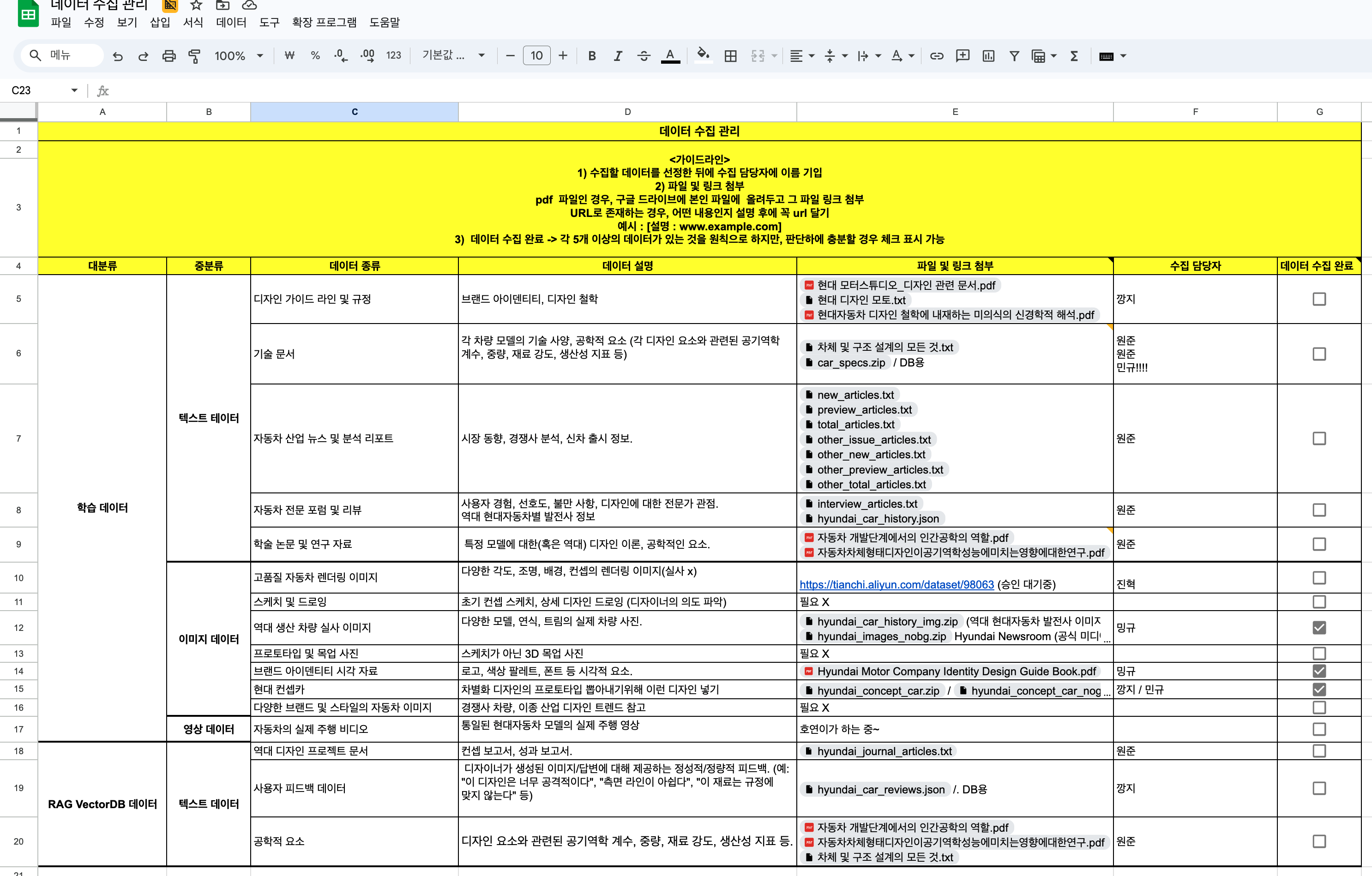 기획 및 설계를 명확하게 하고 나니, 어떤 데이터를 수집해야 하는지 명확하게 그려졌다. 우리는 크게 RAG시스템과 파인튜닝용 데이터를 따로 구분하여 데이터를 수집하였다. 그리고 이를 제대로 관리하기 위한 스프레드 시트에 한눈에 볼 수 있도록 정리하면서 데이터를 수집했다.