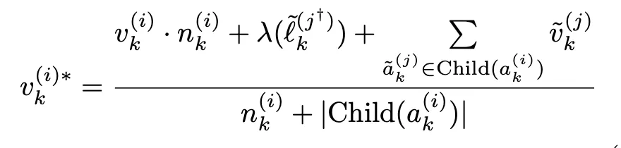 부모 노드의 새로운 값은 “현재 노드의 기존 점수 × 노드 방문횟수 + 시뮬레이션 보상값 + (시뮬레이션)리프 노드의 품질 점수의 합”을 자식 수 + 기존 방문 수로 나눈 가중 평균(weighted average) 형태로 업데이트를 함께 반영하여 계산된다. 이를 통해 HALO는 과업 완료 상태에 대한 민감도를 높이고, reasoning trajectory 전반의 평가 정확도를 향상