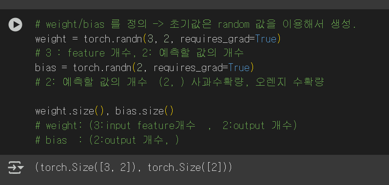 우선 weight를 보면 feature의 개수인 "온도, 강수량, 습도"와 이에 해당되는 예측할 값의 개수인 "사과수확량과 오렌지 수확량"니까 (3,2)가 된다.