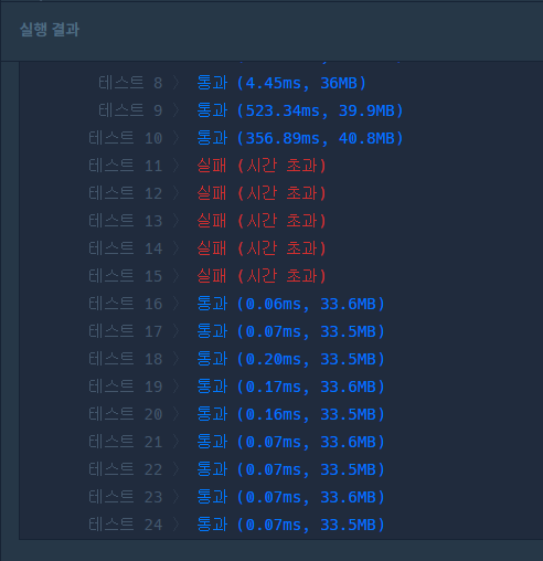 배열 크기가 커지면 커질수록 실행 시간이 기하급수적으로 증가하기 때문에, 특정 테스트에서 시간 초과가 발생하는 것이다.