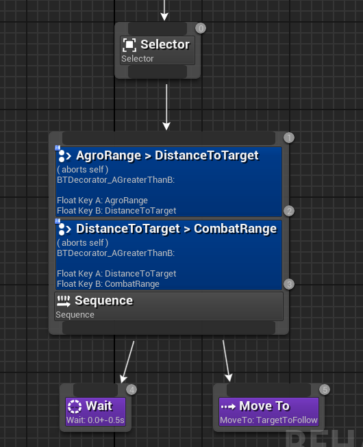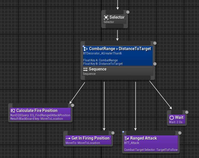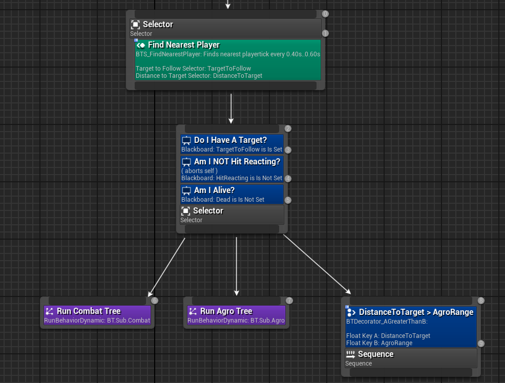 기존 노드 2개(위쪽 2개)는 유지했다. 가장 가까운 플레이어를 찾아 저장하고, 아래 분기들로 진입해도 되는지를 판단하는 노드들이다.