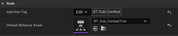 그리고 Run Combat Tree와 Run Agro Tree는 Run Behavior Dynamic 노드인데, Injection Tag를 통해 트리를 주입받는다. 만약 주입받지 못 한 경우 Default Behavior Asset을 사용해 작동한다.