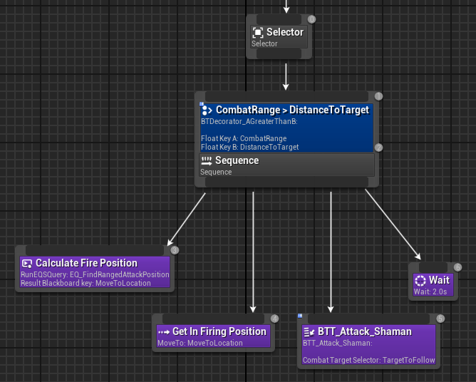 이건 범용 CombatTree다. Shaman은 다른 CombatTree를 사용한다. 그리고 좌측 2개의 노드가 원거리 공격 전용으로 보일 수 있는데, 그냥 장애물을 지나 공격할 수 있는 위치를 찾는 Task일 뿐이다. 따라서 근접 공격에서도 똑같이 작동한다. 사실 발사체가 없다면 무용지물이지만, 근접 공격 캐릭터도 일부 스킬은 원거리가 될 수 있으니 그냥 이거로 퉁친다. 이름은 바꿀 거다. 어쨌든 공격 가능한 상태인지 조건을 확인하고, 공격할 위치를 찾아 이동한 뒤 공격 Task를 실행한다.