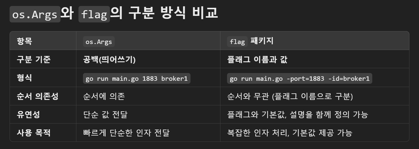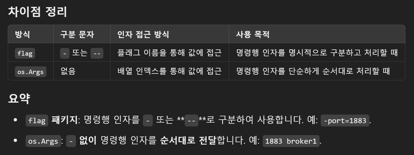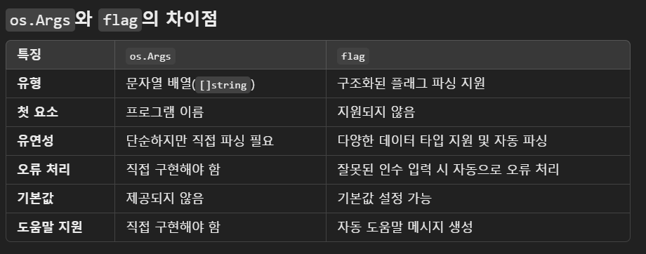 os.Args: 간단한 프로그램에서 빠르게 명령줄 인수를 처리하고 싶을 때 적합flag: 더 복잡한 명령줄 인수 파싱이 필요하거나 다양한 데이터 타입을 다뤄야 할 때 권장