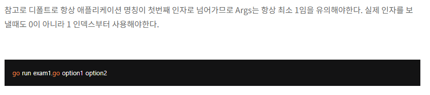 예를 들어 go run hello.go의 경우 run 과 hello.go 를 go 프로그램의 명령행 인자로 사용하고 있다.