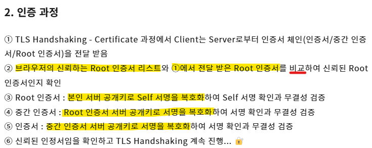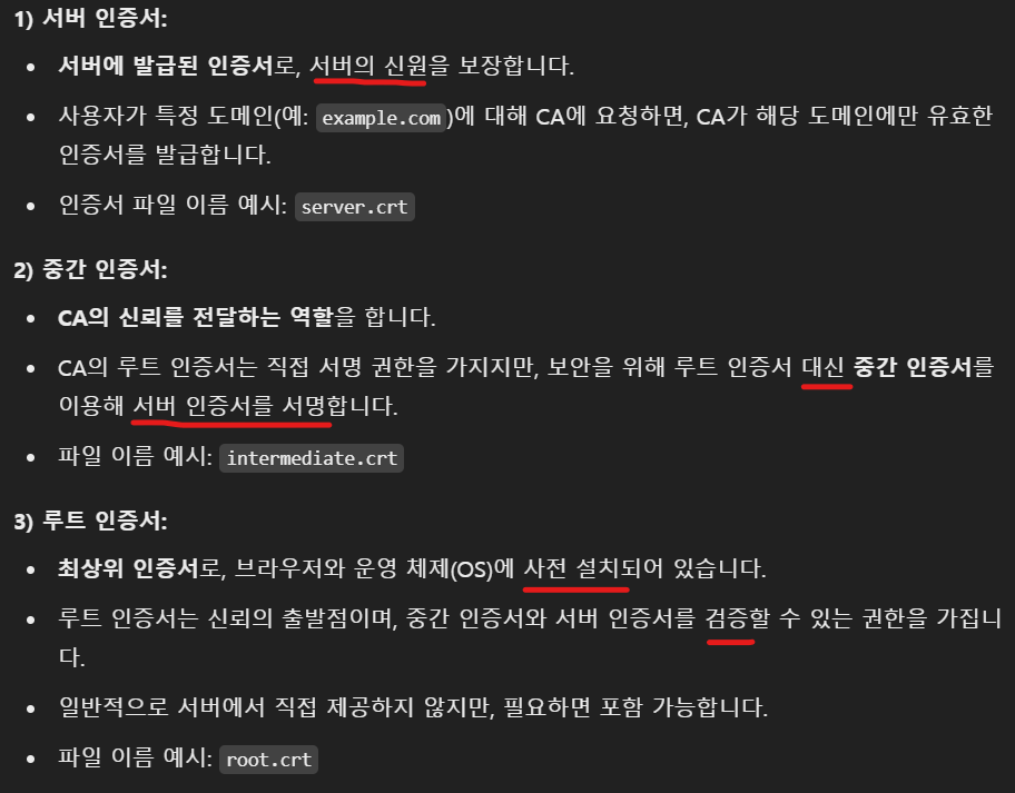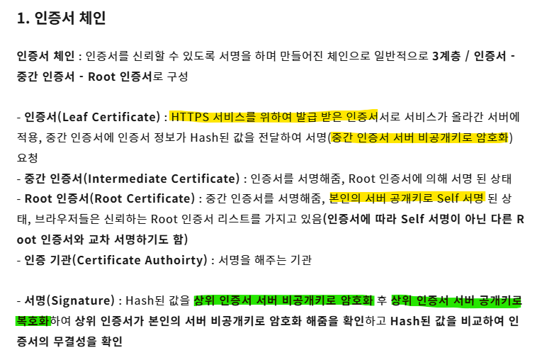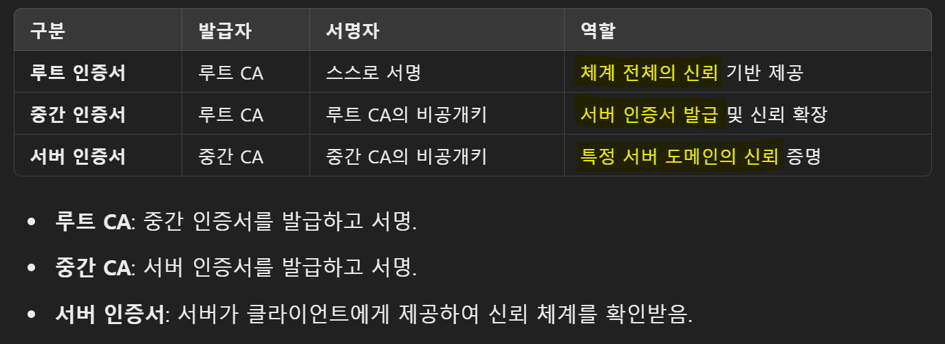 - 서버 인증서 → 중간 인증서 → 루트 인증서 순서로 인증서 체인이 완성