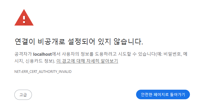 인증서가 자체 서명된 것이므로 브라우저에서 경고 메시지가 표시될 수 있다.