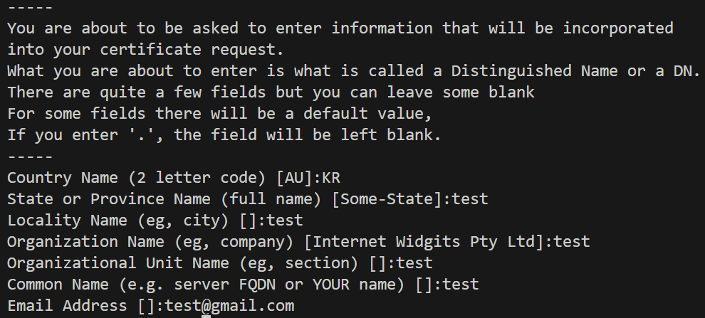 cert.pem) : 서버의 공개 키, 서버의 도메인 이름, CA 정보, 만료 날짜 등 정보 포함!key.pem) : 서버의 개인 키 ← 이 파일은 서버에서만 사용되며 외부로 유출되서는 안 된다!openssl req -x509 -newkey rsa:2048 -nodes -keyout key.pem -out cert.pem -days 365