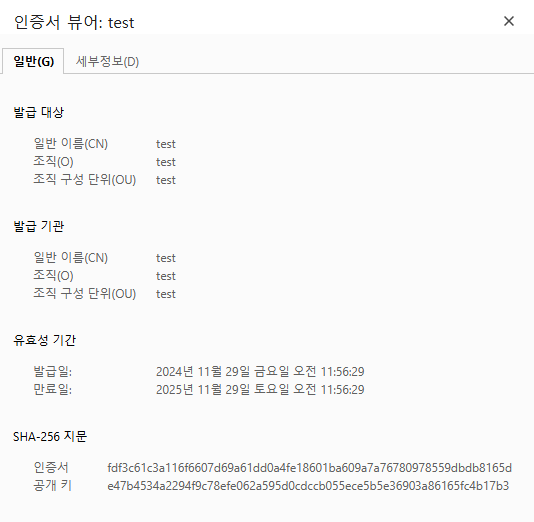 → 인증서 정보도 확인할 수 있다. 유효 기간이 365일로 설정되었고, 인증서와 서버의 공개키 등등을 직접 확인해볼 수 있었다.