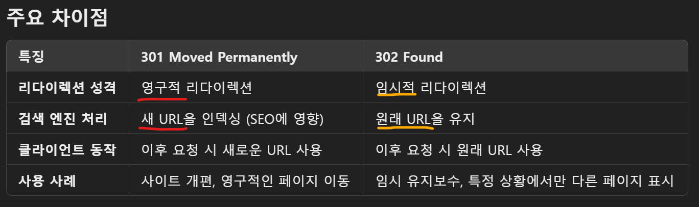 301 Moved Permanently와 302 Found는 모두 클라이언트를 다른 URL로 리다이렉트하기 위한 HTTP 상태 코드이다.