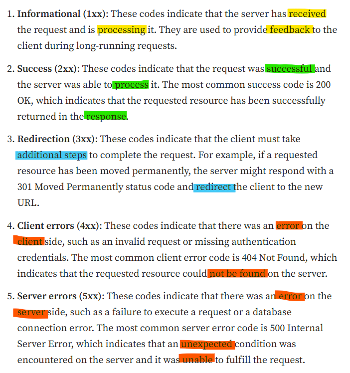 각 상태 코드는 숫자 범위에 따라 특정 카테고리에 속하며, 클라이언트와 서버 간의 의사소통을 명확히 한다.