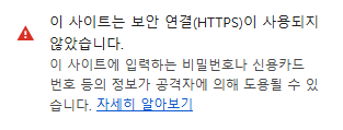 인증된 CA의 인증서가 아닐 경우에는(= 인증서가 유효하지 않은 경우) NOT SECURE로 브라우저에서 보여지게 된다.