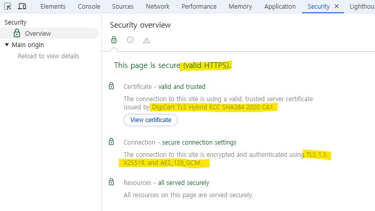 HTTPS 설정과 인증서, 연결 인증 등등에 대해 위에서 알아본 내용이 보인다.