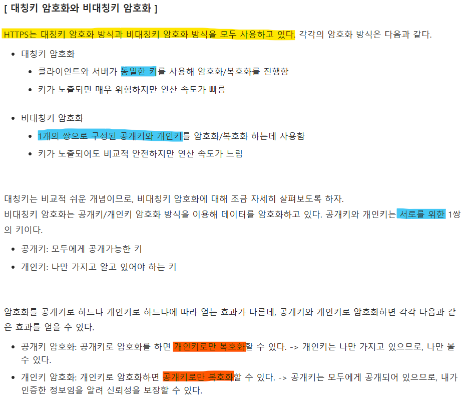 🔑 HTTPS는 대칭키 암호화와 비대칭키 암호화를 모두 사용하여 빠른 연산 속도와 안정성을 모두 얻고 있다.