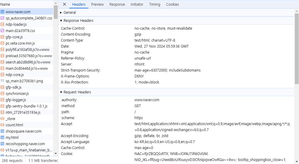 위 사진은 네이버 홈페이지에서 F12 개발자 도구를 활용해 네트워크 트래픽을 확인하는 과정 중 일부이다.