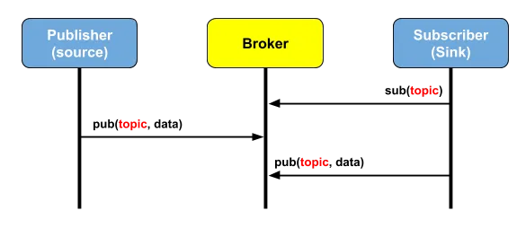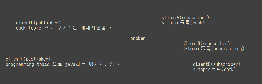 클라이언트들은 메시지를 브로커에게 보내고, 브로커는 해당 메시지를 적절한 구독자들에게 전달한다.