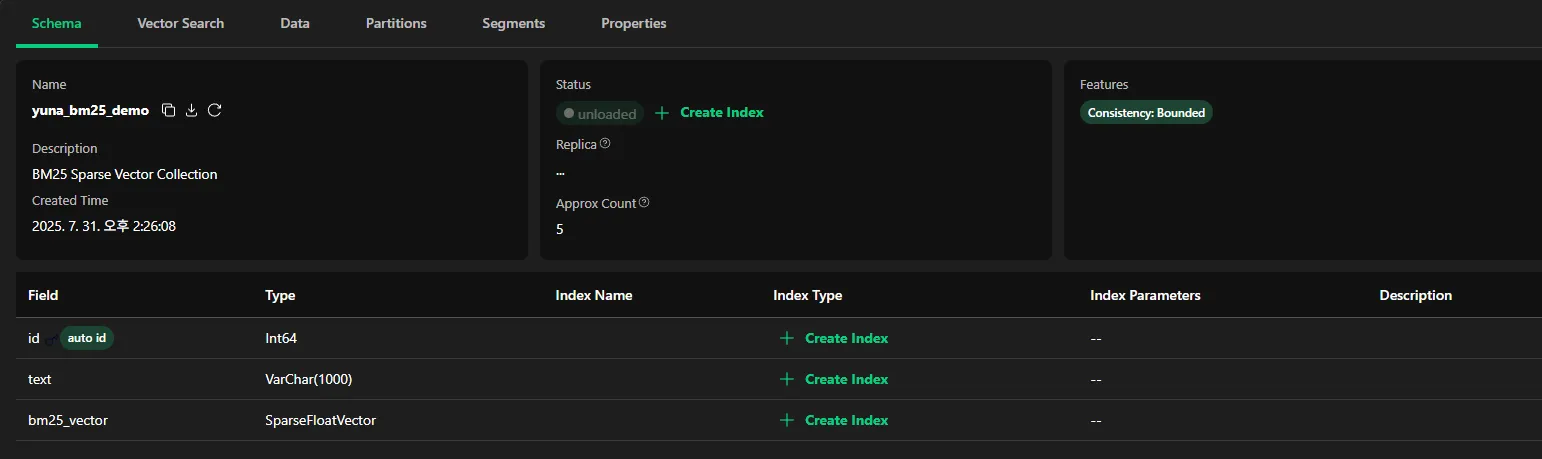 print("✅ bm25_vector 필드: SPARSE_INVERTED_INDEX 인덱스 생성 완료")