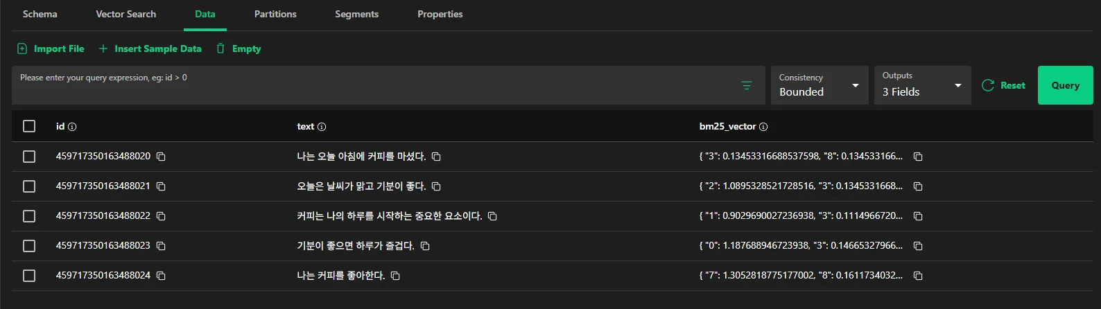 print("✅ BM25 Sparse Vector Milvus 삽입 완료\n")